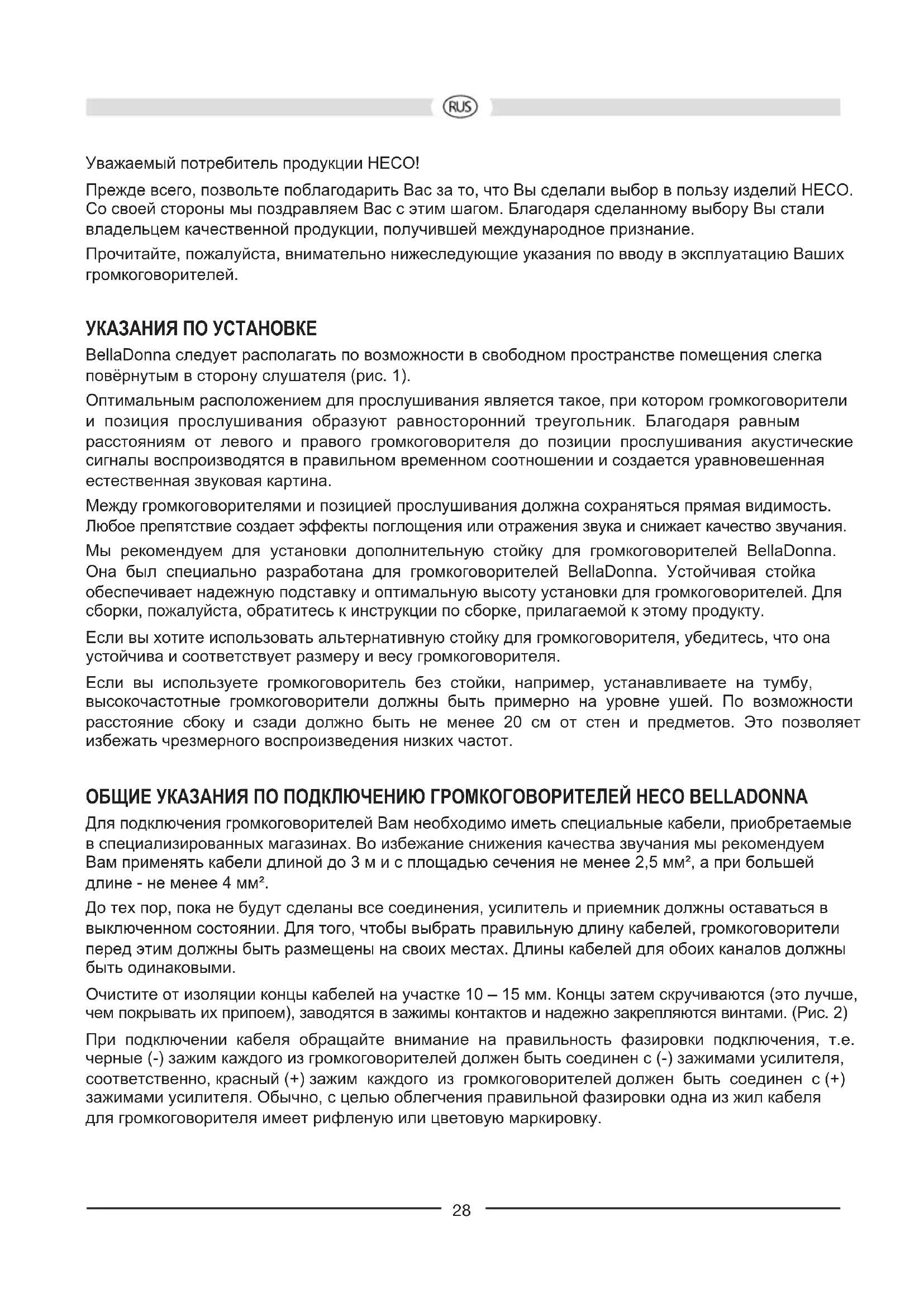 Alla HECO-högtalare är inställda på bästa möjliga klang när klangkontrollerna står i mellanläget, dvs vid linjär återgivning av förstärkaren. Vid starkt uppvridna kontroller tillförs bashögtalaren och/eller diskanthögtalaren mer energi, vilket kan leda till att de förstörs. Om du har en förstärkare med avsevärt högre utgångseffekt än den för boxarna angivna max. tillåtna belastning, kan större ljudstyrka leda till att högtalarna förstörs – vilket emellertid sällan förekommer. Förstärkare med liten utgångseffekt kan redan vid mellanljudstyrka bli mycket farliga för boxarna, eftersom de lättare överstyrs än starka förstärkare. Denna överstyrning förorsakar tydligt mätbar och hörbar distorsion som är mycket farlig för högtalarna. Beakta därför eventuell distorsion när du ändrar ljudstyrkan – och sänk den i så fall genast. Den som lyssnar med hög ljudstyrka måste se til att förstärkaren har minst den ugångseffekt med vilken boxarna kan belastas. ALLMÄNT SAGT.. kan förstärkare, tuner och CD-spelare – inte endast vid lågprisprodukter – generera hörbara svängningar med hög frekvens. Låt en fackman kontrollera anläggningen om diskanthögtalaren bortfaller vid låg resp mellanljudstyrka. SKÖTSEL Torka av ytorna med ett rengöringsmedel för hushållsbruk, använd alltså aldrig möbelpolish eller liknande.27 TEKNISKA DATA BellaDonna Konguration: 2 vägs basreex Max belastning: 150 / 250 W Impedans: 4 – 8 ohm Frekvensområde: 28 – 52 000 Hz Rekommenderad förstärkareffekt: 30 – 250 W Verkningsgrad (1 W/1 m): 91 dB Mått (BxHxD): 276 x 450 x 462 mm Tillbehör: Metall-spikes VI FÖRBEHÅLLER OSS RÄTTEN TILL TEKNISKA ÄNDRINGAR.28 Уважаемый потребитель продукции HECO! Прежде всего, позвольте поблагодарить Вас за то, что Вы сделали выбор в пользу изделий HECO. Со своей стороны мы поздравляем Вас с этим шагом. Благодаря сделанному выбору Вы стали владельцем качественной продукции, получившей международное признание. Прочитайте, пожалуйста, внимательно нижеследующие указания по вводу в эксплуатацию Ваших громкоговорителей. УКАЗАНИЯ ПО УСТАНОВКЕ BellaDonna следует располагать по возможности в свободном пространстве помещения слегка повёрнутым в сторону слушателя (рис. 1). Оптимальным расположением для прослушивания является такое, при котором громкоговорители и позиция прослушивания образуют равносторонний треугольник. Благодаря равным расстояниям от левого и правого громкоговорителя до позиции прослушивания акустические сигналы воспроизводятся в правильном временном соотношении и создается уравновешенная естественная звуковая картина. Между громкоговорителями и позицией прослушивания должна сохраняться прямая видимость. Любое препятствие создает эффекты поглощения или отражения звука и снижает качество звучания. Мы рекомендуем для установки дополнительную стойку для громкоговорителей BellaDonna. Она был специально разработана для громкоговорителей BellaDonna. Устойчивая стойка обеспечивает надежную подставку и оптимальную высоту установки для громкоговорителей. Для сборки, пожалуйста, обратитесь к инструкции по сборке, прилагаемой к этому продукту. Если вы хотите использовать альтернативную стойку для громкоговорителя, убедитесь, что она устойчива и соответствует размеру и весу громкоговорителя. Если вы используете громкоговоритель без стойки, например, устанавливаете на тумбу, высокочастотные громкоговорители должны быть примерно на уровне ушей. По возможности расстояние сбоку и сзади должно быть не менее 20 см от стен и предметов. Это позволяет избежать чрезмерного воспроизведения низких частот. ОБЩИЕ УКАЗАНИЯ ПО ПОДКЛЮЧЕНИЮ ГРОМКОГОВОРИТЕЛЕЙ HECO BELLADONNA Для подключения громкоговорителей Вам необходимо иметь специальные кабели, приобретаемые в специализированных магазинах. Во избежание снижения качества звучания мы рекомендуем Вам применять кабели длиной до 3 м и с площадью сечения не менее 2,5 мм², а при большей длине - не менее 4 мм². До тех пор, пока не будут сделаны все соединения, усилитель и приемник должны