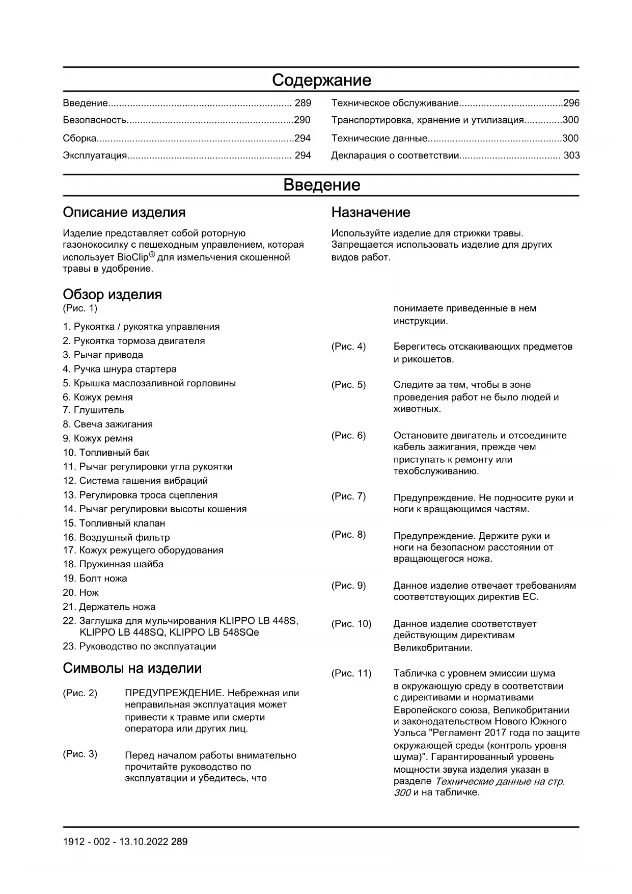 (Pис. 6) Остановите двигатель и отсоедините кабель зажигания, прежде чем приступать к ремонту или техобслуживанию. (Pис. 7) Предупреждение. Не подносите руки и ноги к вращающимся частям. (Pис. 8) Предупреждение. Держите руки и ноги на безопасном расстоянии от вращающегося ножа. (Pис. 9) Данное изделие отвечает требованиям соответствующих директив ЕС. (Pис. 10) Данное изделие соответствует действующим директивам Великобритании. (Pис. 11) Табличка с уровнем эмиссии шума в окружающую среду в соответствии с директивами и нормативами Европейского союза, Великобритании и законодательством Нового Южного Уэльса "Регламент 2017 года по защите окружающей среды (контроль уровня шума)". Гарантированный уровень мощности звука изделия указан в