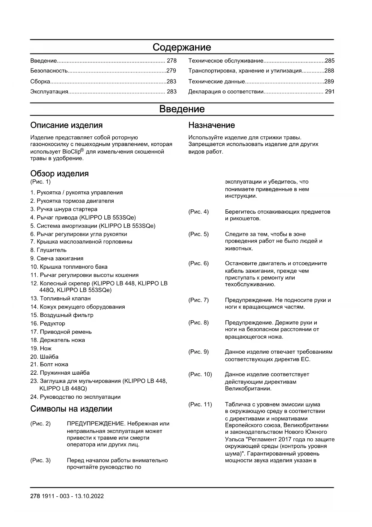 (Pис. 6) Остановите двигатель и отсоедините кабель зажигания, прежде чем приступать к ремонту или техобслуживанию. (Pис. 7) Предупреждение. Не подносите руки и ноги к вращающимся частям. (Pис. 8) Предупреждение. Держите руки и ноги на безопасном расстоянии от вращающегося ножа. (Pис. 9) Данное изделие отвечает требованиям соответствующих директив ЕС. (Pис. 10) Данное изделие соответствует действующим директивам Великобритании. (Pис. 11) Табличка с уровнем эмиссии шума в окружающую среду в соответствии с директивами и нормативами Европейского союза, Великобритании и законодательством Нового Южного Уэльса "Регламент 2017 года по защите окружающей среды (контроль уровня шума)". Гарантированный уровень мощности звука изделия указан в 278 1911 - 003 - 13.10.2022разделе Технические данные на стр.