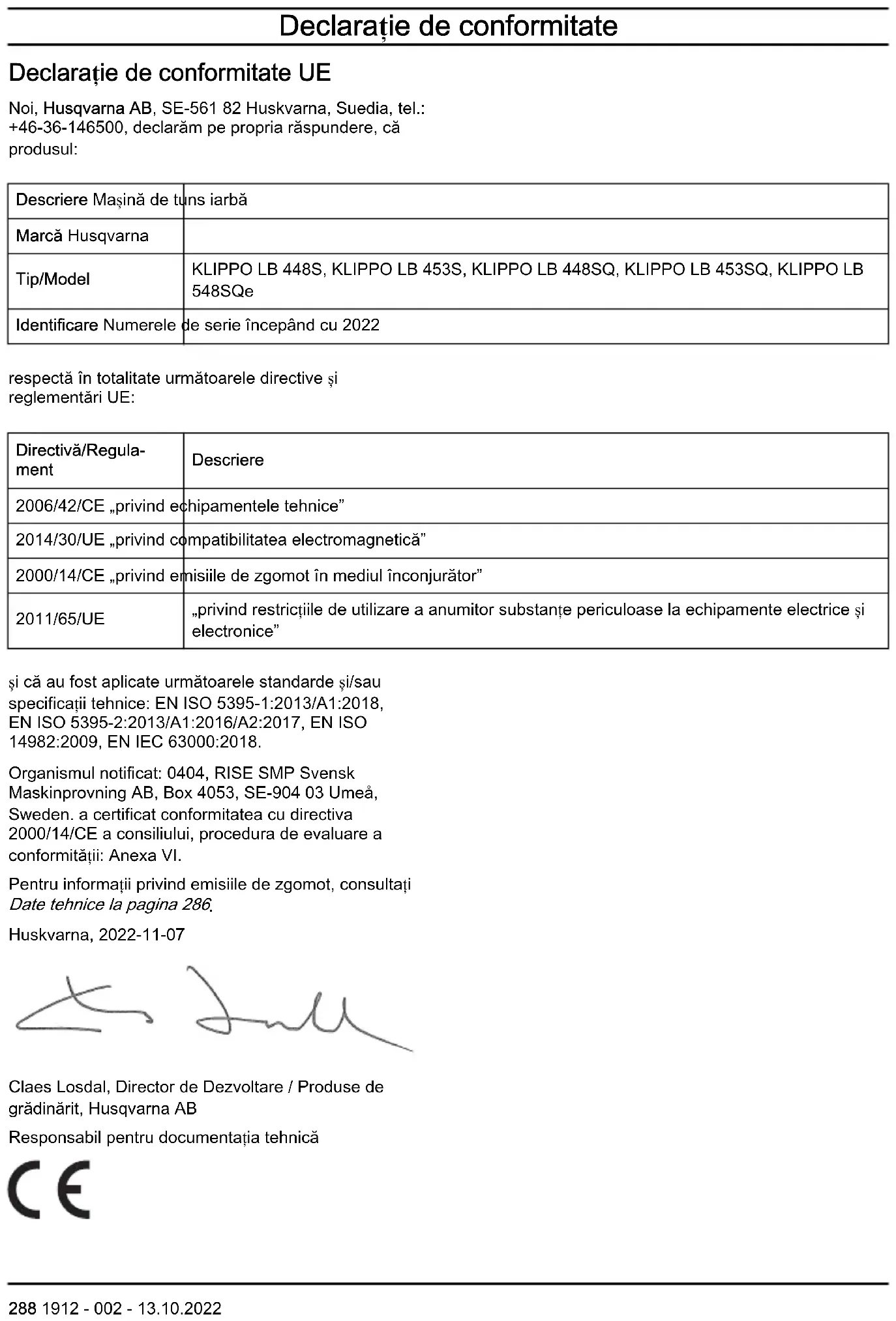 Скорость, км/ч 4,5 4,5 4,5 4,5 4,5 302 1912 - 002 - 13.10.2022Декларация о соответствии Декларация соответствия требованиям ЕС Мы, компания Husqvarna AB, SЕ-561 82 Huskvarna, Швеция, тел.: +46-36-146500, с полной ответственностью заявляем, что изделие: Описание Газонокосилка Марка Husqvarna Тип / Модель KLIPPO LB 448S, KLIPPO LB 453S, KLIPPO LB 448SQ, KLIPPO LB 453SQ, KLIPPO LB 548SQe Идентификация Серийные номера начиная с 2022 года и далее полностью соответствует следующим директивам и нормативам ЕС: Директива/Норма-