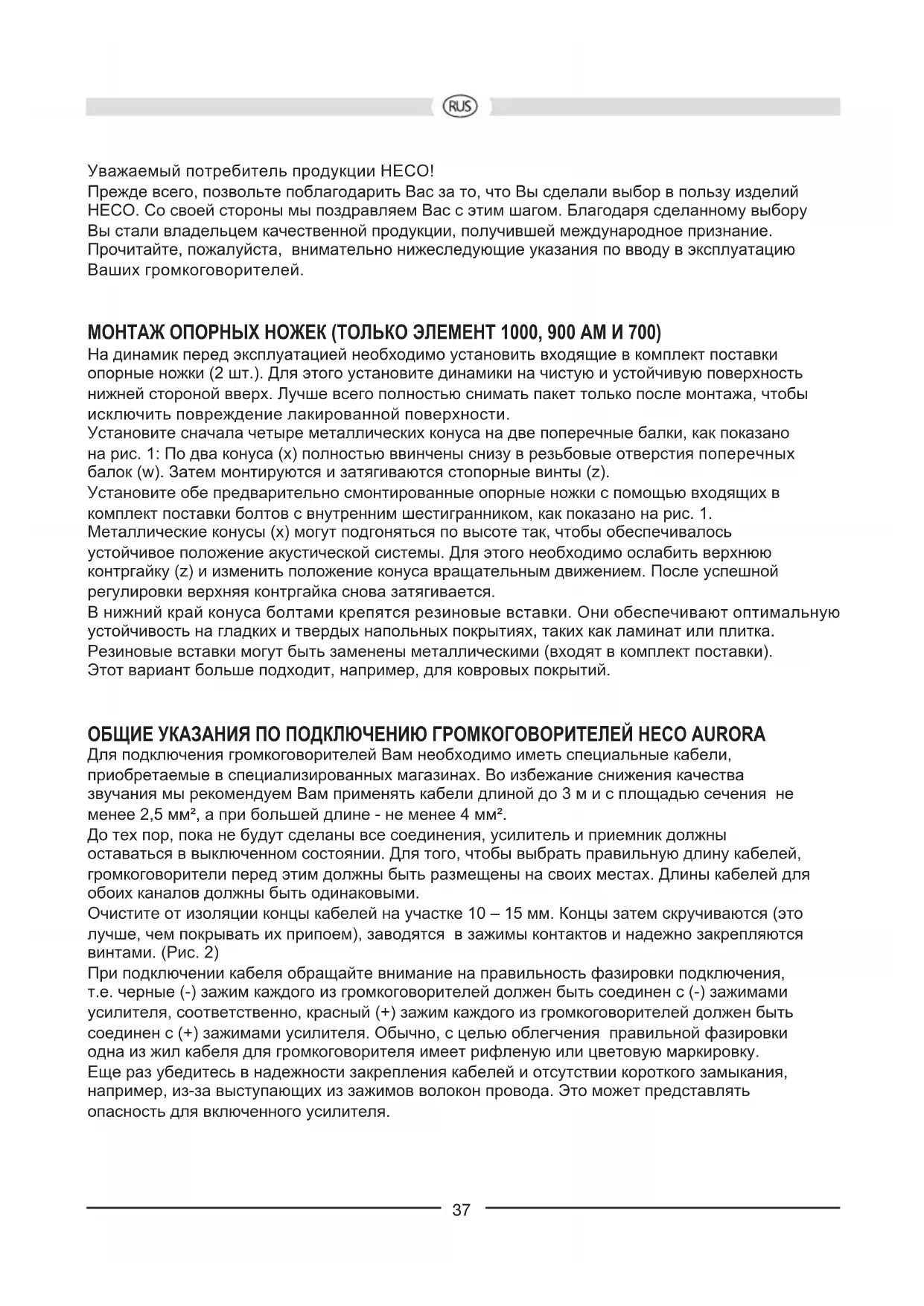 Konfiguration: 2 vägs basreflex 2 vägs basreflex Max belastning: 65 / 120 W 90 / 150 W Impedans: 4 – 8 ohm 4 – 8 ohm Frekvensområde: 38 – 42 500 Hz 34– 42 500 Hz Rekommenderad förstärkareffekt: 20 – 150 W 20 – 150 W Verkningsgrad (2.8V/1m): 89 dB 90 dB Mått (BxHxD): 170 x 308 x 245 mm 490 x 177 x 303 mm Tillbehör: Hårdgummi-spikes Hårdgummi-spikes VI FÖRBEHÅLLER OSS RÄTTEN TILL TEKNISKA ÄNDRINGAR.Уважаемый потребитель продукции HECO! Прежде всего, позвольте поблагодарить Вас за то, что Вы сделали выбор в пользу изделий HECO. Со своей стороны мы поздравляем Вас с этим шагом. Благодаря сделанному выбору Вы стали владельцем качественной продукции, получившей международное признание. Прочитайте, пожалуйста, внимательно нижеследующие указания по вводу в эксплуатацию Ваших громкоговорителей. МОНТАЖ ОПОРНЫХ НОЖЕК (ТОЛЬКО ЭЛЕМЕНТ 1000, 900 AM И 700) На динамик перед эксплуатацией необходимо установить входящие в комплект поставки опорные ножки (2 шт.). Для этого установите динамики на чистую и устойчивую поверхность нижней стороной вверх. Лучше всего полностью снимать пакет только после монтажа, чтобы исключить повреждение лакированной поверхности. Установите сначала четыре металлических конуса на две поперечные балки, как показано на рис. 1: По два конуса (x) полностью ввинчены снизу в резьбовые отверстия поперечных балок (w). Затем монтируются и затягиваются стопорные винты (z). Установите обе предварительно смонтированные опорные ножки с помощью входящих в комплект поставки болтов с внутренним шестигранником, как показано на рис. 1. Металлические конусы (x) могут подгоняться по высоте так, чтобы обеспечивалось устойчивое положение акустической системы. Для этого необходимо ослабить верхнюю контргайку (z) и изменить положение конуса вращательным движением. После успешной регулировки верхняя контргайка снова затягивается. В нижний край конуса болтами крепятся резиновые вставки. Они обеспечивают оптимальную устойчивость на гладких и твердых напольных покрытиях, таких как ламинат или плитка. Резиновые вставки могут быть заменены металлическими (входят в комплект поставки). Этот вариант больше подходит, например, для ковровых покрытий. ОБЩИЕ УКАЗАНИЯ ПО ПОДКЛЮЧЕНИЮ ГРОМКОГОВОРИТЕЛЕЙ HECO AURORA Для подключения громкоговорителей Вам необходимо иметь специальные кабели, приобретаемые в специализированных магазинах. Во избежание снижения качества звучания мы рекомендуем Вам применять кабели длиной до 3 м и с площадью сечения не менее 2,5 мм², а при большей длине - не менее 4 мм². До тех пор, пока не будут сделаны все соединения, усилитель и приемник должны оставаться в выключенном состоянии. Для того, чтобы выбрать правильную длину кабелей, громкоговорители перед этим должны быть размещены на своих местах. Длины кабелей для обоих каналов должны быть одинаковыми. Очистите от изоляции концы кабелей на участке 10 – 15 мм. Концы затем скручиваются (это лучше, чем покрывать их припоем), заводятся в зажимы контактов и надежно закрепляются винтами. (Рис. 2) При подключении кабеля обращайте внимание на правильность фазировки подключения, т.е. черные (-) зажим каждого из громкоговорителей должен быть соединен с (-) зажимами усилителя, соответственно, красный (+) зажим каждого из громкоговорителей должен быть соединен с (+) зажимами усилителя. Обычно, с целью облегчения правильной фазировки одна из жил кабеля для громкоговорителя имеет рифленую или цветовую маркировку. Еще раз убедитесь в надежности закрепления кабелей и о