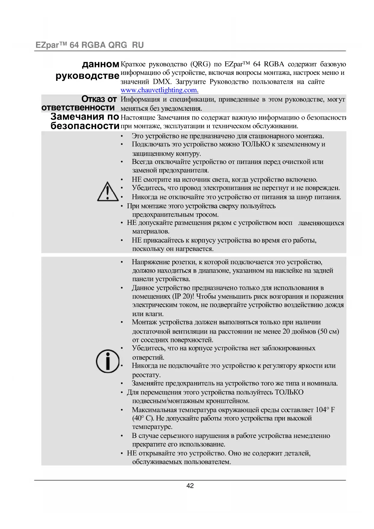 руководстве Краткое руководство (QRG) по EZpar™ 64 RGBA содержит базовую информацию об устройстве, включая вопросы монтажа, настроек меню и значений DMX. Загрузите Руководство пользователя на сайте www.chauvetlighting.com.