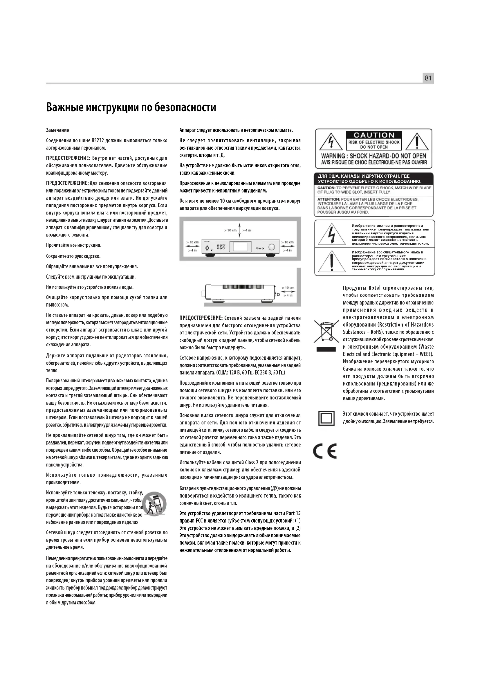 Требования к электропитаниюТребования к электропитанию США: 120 В, 60 Гц ЕС: 230 В, 50 Гц Потребление в режиме StandbyПотребление в режиме Standby Normal < 0,5 Вт Потребляемая мощностьПотребляемая мощность 280 Вт БТЕБТЕ (4 Ом, при 1/8 мощности) 733 БТЕ / ч ГабаритыГабариты (Ш Х В Х Г) 430 х 93 х 345 мм Высота передней панели Высота передней панели 80 мм Масса неттоМасса нетто 9,15 кг Все технические характеристики соответствуют действительности на дату издания. Компания Rotel оставляет за собой право модернизировать изделия без предварительного уведомления. Rotel и логотип Rotel HiFi – это зарегистрированные торговые марки Rotel Co., Ltd. Tokyo, Japan. Логотипы “Made for iPod” («Для работы с iPod») и “Made for iPhone” («Для работы совместно с iPhone») означают, что данное электронное устройство было разработано для соединения именно с устройствами iPod и iPhone соответственно, а также было сертифицировано разработчиком как соответствующее стандартам компании Apple. Компания Apple не несет ответственности за работу данного устройства, а также за его соответствие стандартам безопасности и другим нормативам. Обратите внимание, что использование этого устройства совместно с iPod или iPhone может повлиять на работу беспроводной сети. iPhone, iPod, iPod classic, iPod nano и iPod touch – это торговые марки Apple Inc., зарегистрированные в США и других странах. Использование значка «Работает с Apple AirPlay» означает, что аксессуар был разработан специально для работы с технологией, указанной на значке, и сертифицирован разработчиком на соответствие стандартам производительности Apple. Для управления этим устройством с поддержкой AirPlay 2 требуется iOS