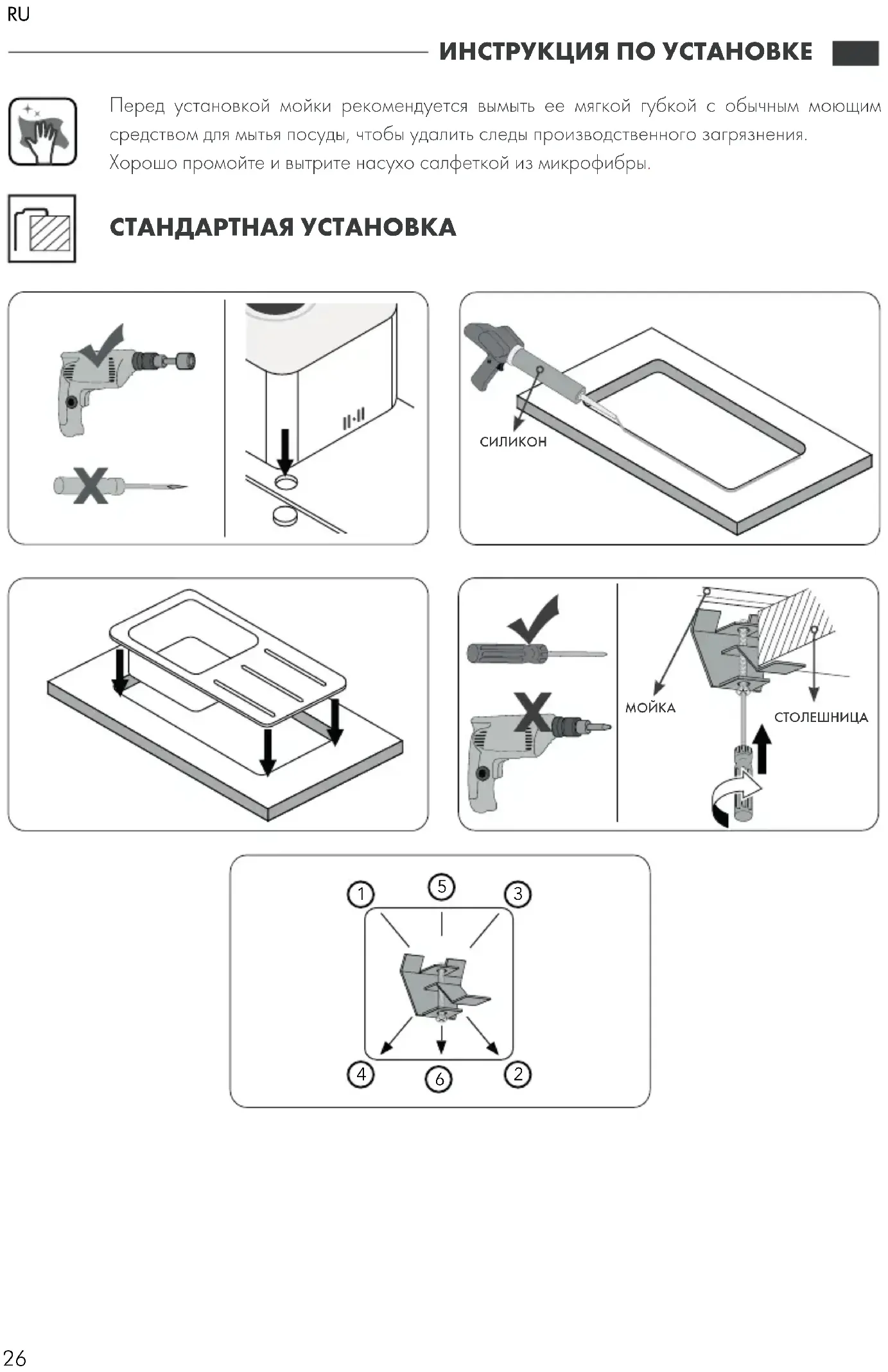 ИНСТРУКЦИЯ ПО УСТАНОВКЕ Перед установкой мойки рекомендуется вымыть ее мягкой губкой с обычным моющим средством для мытья посуды, чтобы удалить следы производственного загрязнения. Хорошо промойте и вытрите насухо салфеткой из микрофибры. СТАНДАРТНАЯ УСТАНОВКА МОЙКАСТОЛЕШНИЦАСИЛИКОН27