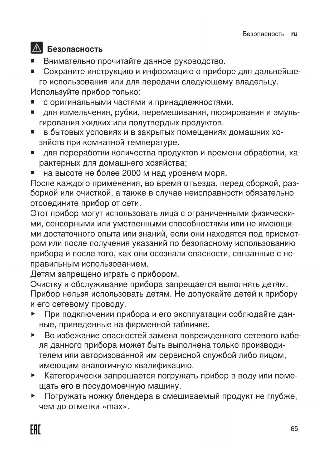 Безопасность ¡ Внимательно прочитайте данное руководство. ¡ Сохраните инструкцию и информацию о приборе для дальнейше- го использования или для передачи следующему владельцу. Используйте прибор только: ¡ с оригинальными частями и принадлежностями. ¡ для измельчения, рубки, перемешивания, пюрирования и эмуль- гирования жидких или полутвердых продуктов. ¡ в бытовых условиях и в закрытых помещениях домашних хо- зяйств при комнатной температуре. ¡ для переработки количества продуктов и времени обработки, ха- рактерных для домашнего хозяйства; ¡ на высоте не более 2000м над уровнем моря. После каждого применения, во время отъезда, перед сборкой, раз- боркой или очисткой, а также в случае неисправности обязательно отсоедините прибор от сети. Этот прибор могут использовать лица с ограниченными физически- ми, сенсорными или умственными способностями или не имеющи- ми достаточного опыта или знаний, если они находятся под присмот- ром или после получения указаний по безопасному использованию прибора и после того, как они осознали опасности, связанные с не- правильным использованием. Детям запрещено играть с прибором. Очистку и обслуживание прибора запрещается выполнять детям. Прибор нельзя использовать детям. Не допускайте детей к прибору и его сетевому проводу. ▶ При подключении прибора и его эксплуатации соблюдайте дан- ные, приведенные на фирменной табличке. ▶ Во избежание опасностей замена поврежденного сетевого кабе- ля данного прибора может быть выполнена только производи- телем или авторизованной им сервисной службой либо лицом, имеющим аналогичную квалификацию. ▶ Категорически запрещается погружать прибор в воду или поме- щать его в посудомоечную машину. ▶ Погружать ножку блендера в смешиваемый продукт не глубже, чем до отметки «max».ru Предотвращение материального ущерба