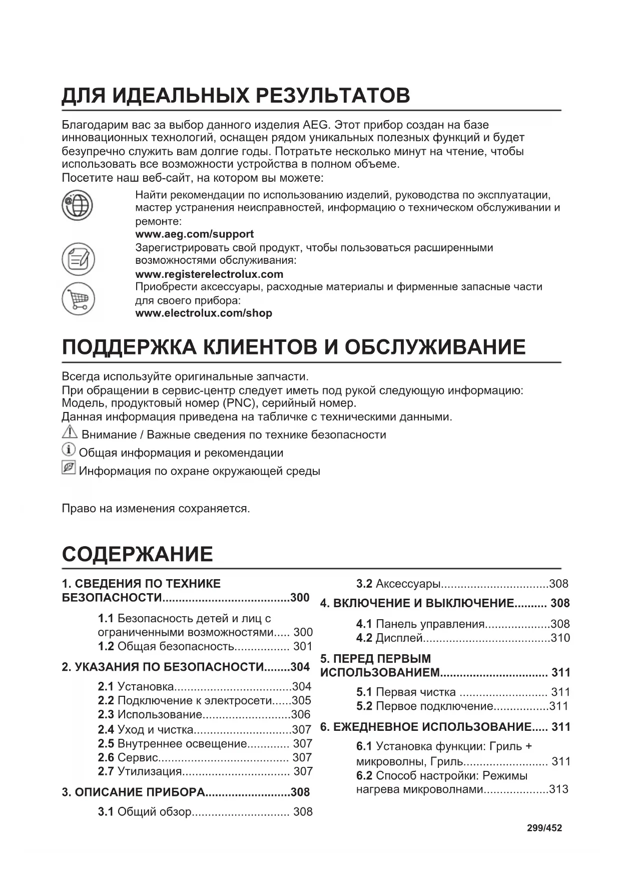 www.aeg.com/support Зарегистрировать свой продукт, чтобы пользоваться расширенными возможностями обслуживания: www.registerelectrolux.com Приобрести аксессуары, расходные материалы и фирменные запасные части для своего прибора: www.electrolux.com/shop ПОДДЕРЖКА КЛИЕНТОВ И ОБСЛУЖИВАНИЕ Всегда используйте оригинальные запчасти. При обращении в сервис-центр следует иметь под рукой следующую информацию: Модель, продуктовый номер (PNC), серийный номер. Данная информация приведена на табличке с техническими данными. Внимание / Важные сведения по технике безопасности Общая информация и рекомендации Информация по охране окружающей среды Право на изменения сохраняется.