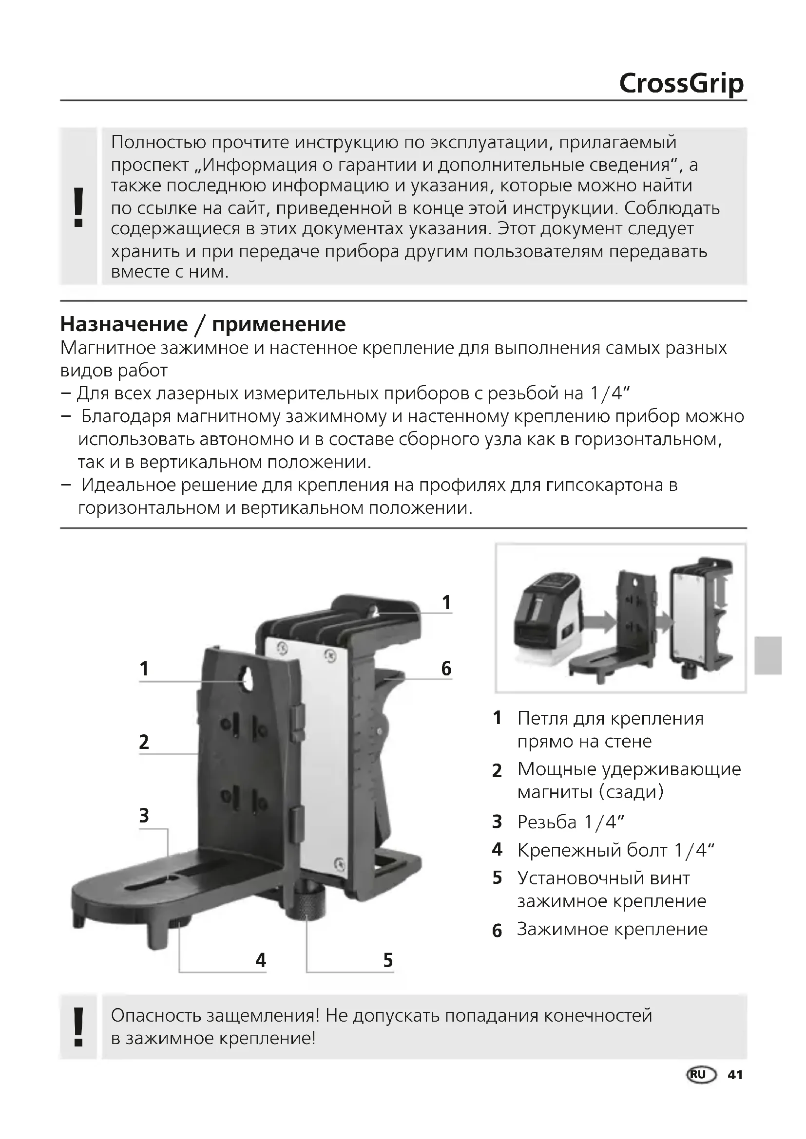 Назначение / применение Магнитное зажимное и настенное крепление для выполнения самых разных видов работ – Для всех лазерных измерительных приборов с резьбой на 1/4“ – Благодаря магнитному зажимному и настенному креплению прибор можно использовать автономно и в составе сборного узла как в горизонтальном, так и в вертикальном положении. – Идеальное решение для крепления на профилях для гипсокартона в горизонтальном и вертикальном положении. Полностью прочтите инструкцию по эксплуатации, прилагаемый проспект „Информация о гарантии и дополнительные сведения“, а также последнюю информацию и указания, которые можно найти по ссылке на сайт, приведенной в конце этой инструкции. Соблюдать содержащиеся в этих документах указания. Этот документ следует хранить и при передаче прибора другим пользователям передавать вместе с ним.