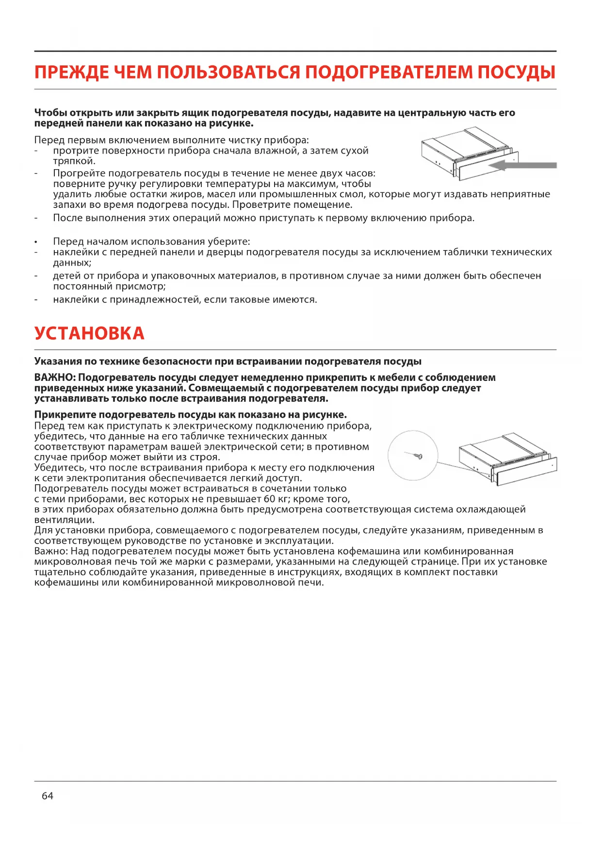 Указания по технике безопасности при встраивании подогревателя посуды ВАЖНО: Подогреватель посуды следует немедленно прикрепить к мебели с соблюдением приведенных ниже указаний. Совмещаемый с подогревателем посуды прибор следует устанавливать только после встраивания подогревателя. Прикрепите подогреватель посуды как показано на рисунке. Перед тем как приступать к электрическому подключению прибора, убедитесь, что данные на его табличке технических данных соответствуют параметрам вашей электрической сети; в противном случае прибор может выйти из строя. Убедитесь, что после встраивания прибора к месту его подключения к сети электропитания обеспечивается легкий доступ. Подогреватель посуды может встраиваться в сочетании только с теми приборами, вес которых не превышает 60 кг; кроме того, в этих приборах обязательно должна быть предусмотрена соответствующая система охлаждающей вентиляции. Для установки прибора, совмещаемого с подогревателем посуды, следуйте указаниям, приведенным в соответствующем руководстве по установке и эксплуатации. Важно: Над подогревателем посуды может быть установлена кофемашина или комбинированная микроволновая печь той же марки с размерами, указанными на следующей странице. При их установке тщательно соблюдайте указания, приведенные в инструкциях, входящих в комплект поставки кофемашины или комбинированной микроволновой печи.RU