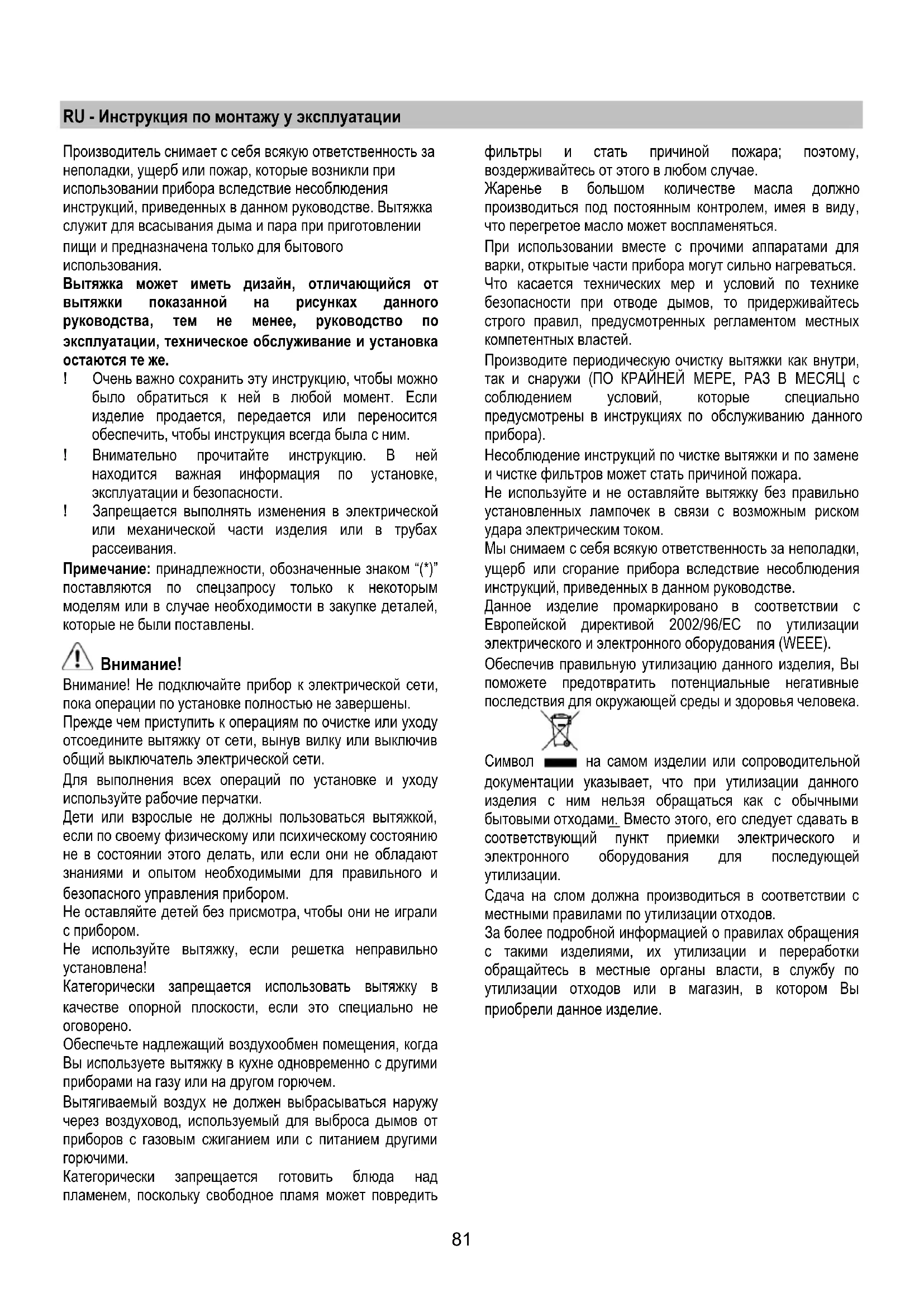 Несоблюдение инструкций по чистке вытяжки и по замене и чистке фильтров может стать причиной пожара. Не используйте и не оставляйте вытяжку без правильно установленных лампочек в связи с возможным риском удара электрическим током. Мы снимаем с себя всякую ответственность за неполадки, ущерб или сгорание прибора вследствие несоблюдения инструкций, приведенных в данном руководстве. Данное изделие промаркировано в соответствии с Европейской директивой 2002/96/EC по утилизации электрического и электронного оборудования (WEEE). Обеспечив правильную утилизацию данного изделия, Вы поможете предотвратить потенциальные негативные последствия для окружающей среды и здоровья человека.