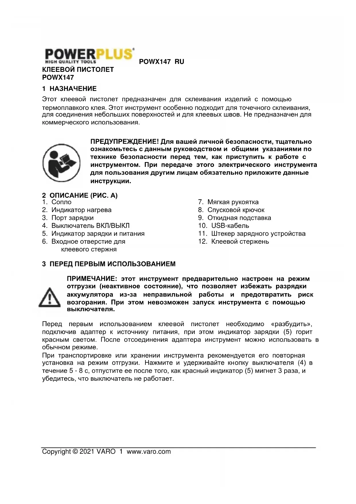 MEGJEGYZÉS: az energiatakarékosság érdekében a ragasztópisztoly 10 perc elteltével automatikusan kikapcsol.POWX147 RU Copyright © 2021 VARO 1 www.varo.com КЛЕЕВОЙ ПИСТОЛЕТ POWX147 1 НАЗНАЧЕНИЕ Этот клеевой пистолет предназначен для склеивания изделий с помощью термоплавкого клея. Этот инструмент особенно подходит для точечного склеивания, для соединения небольших поверхностей и для клеевых швов. Не предназначен для коммерческого использования. ПРЕДУПРЕЖДЕНИЕ! Для вашей личной безопасности, тщательно ознакомьтесь с данным руководством и общими указаниями по технике безопасности перед тем, как приступить к работе с инструментом. При передаче этого электрического инструмента для пользования другим лицам обязательно приложите данные инструкции. 2 ОПИСАНИЕ (РИС. A)