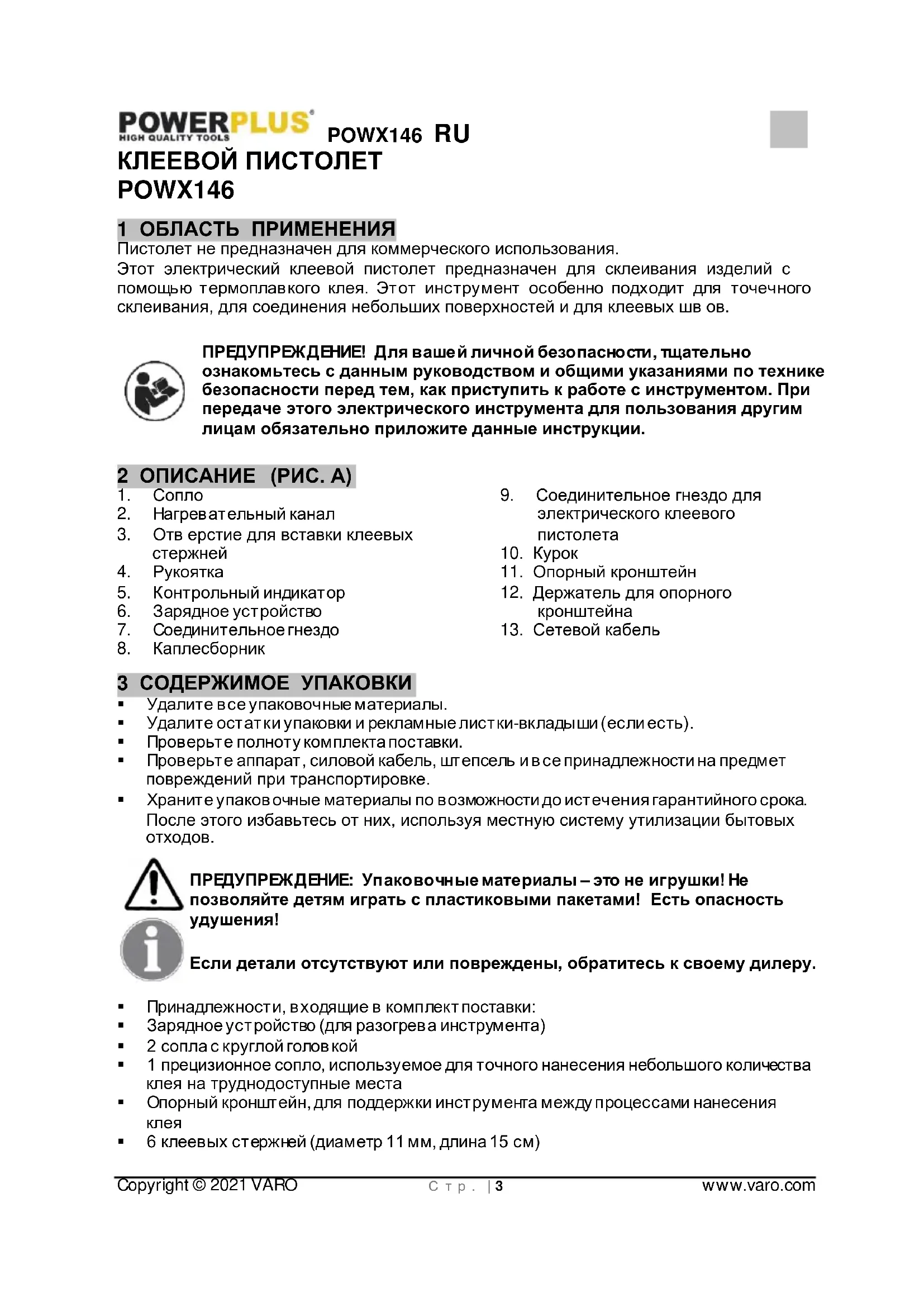- 16 ДЕКЛАРАЦИЯ О СООТВЕТСТВИИ POWX146 RU Copyright © 2021 VARO С т р . | 3 www.varo.com КЛЕЕВОЙ ПИСТОЛЕТ POWX146 1 ОБЛАСТЬ ПРИМЕНЕНИЯ Пистолет не предназначен для коммерческого использования. Этот электрический клеевой пистолет предназначен для склеивания изделий с помощью термоплавкого клея. Этот инструмент особенно подходит для точечного склеивания, для соединения небольших поверхностей и для клеевых шв ов. ПРЕДУПРЕЖДЕНИЕ! Для вашей личной безопасности, тщательно ознакомьтесь с данным руководством и общими указаниями по технике безопасности перед тем, как приступить к работе с инструментом. При передаче этого электрического инструмента для пользования другим лицам обязательно приложите данные инструкции. 2 ОПИСАНИЕ (РИС. A) p. 12