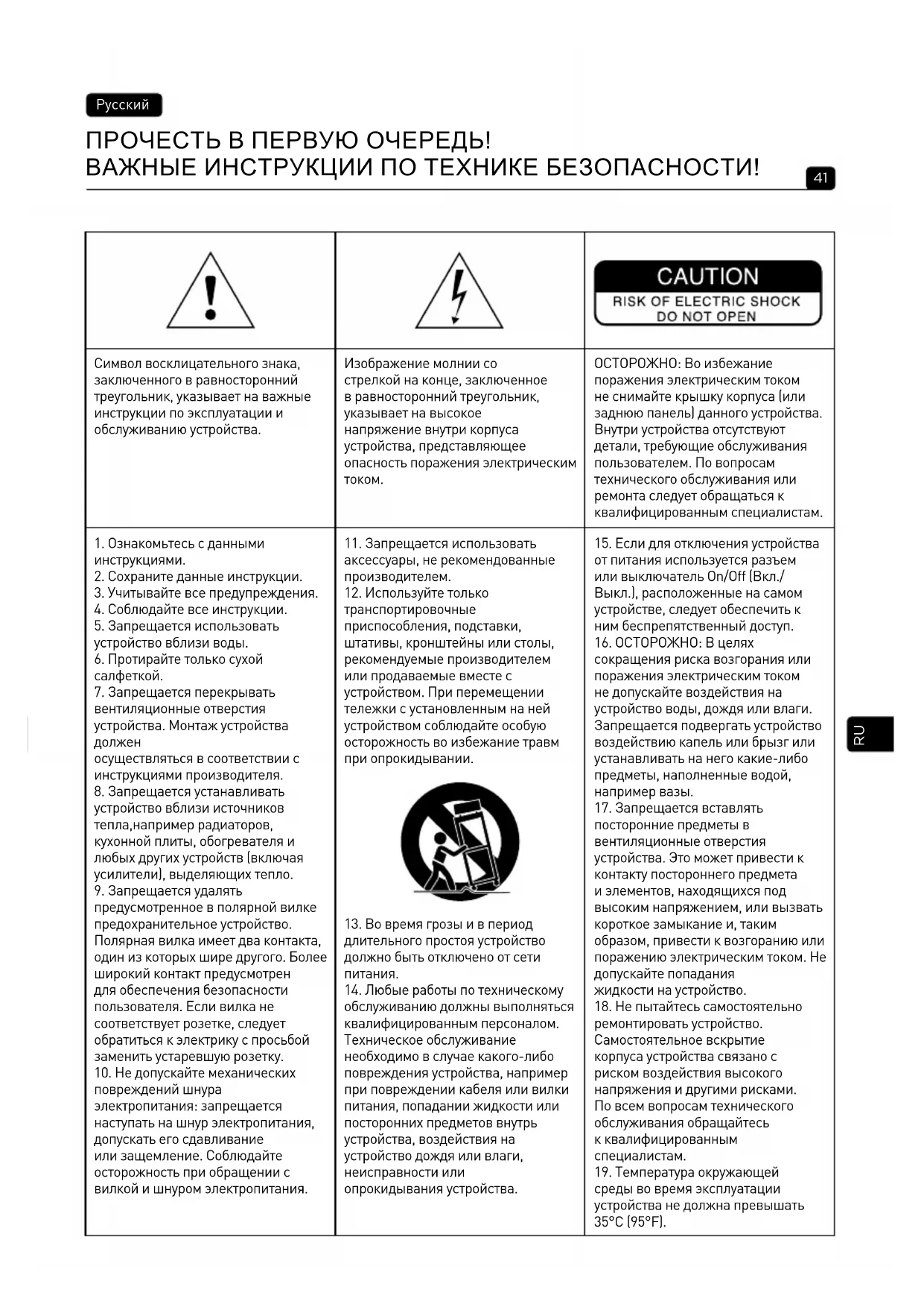 ОСТОРОЖНО: Во избежание поражения электрическим током не снимайте крышку корпуса (или заднюю панель) данного устройства. Внутри устройства отсутствуют детали, требующие обслуживания пользователем. По вопросам технического обслуживания или ремонта следует обращаться к квалифицированным специалистам.