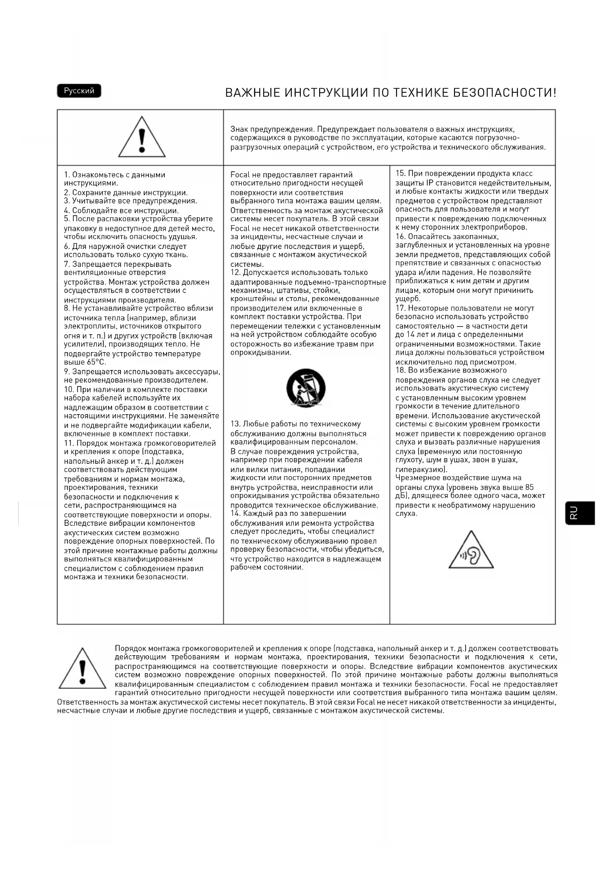 Порядок монтажа громкоговорителей и крепления к опоре (подставка, напольный анкер и т. д.) должен соответствовать действующим требованиям и нормам монтажа, проектирования, техники безопасности и подключения к сети, распространяющимся на соответствующие поверхности и опоры. Вследствие вибрации компонентов акустических систем возможно повреждение опорных поверхностей. По этой причине монтажные работы должны выполняться квалифицированным специалистом с соблюдением правил монтажа и техники безопасности. Focal не предоставляет гарантий относительно пригодности несущей поверхности или соответствия выбранного типа монтажа вашим целям. Ответственность за монтаж акустической системы несет покупатель. В этой связи Focal не несет никакой ответственности за инциденты, несчастные случаи и любые другие последствия и ущерб, связанные с монтажом акустической системы.RU