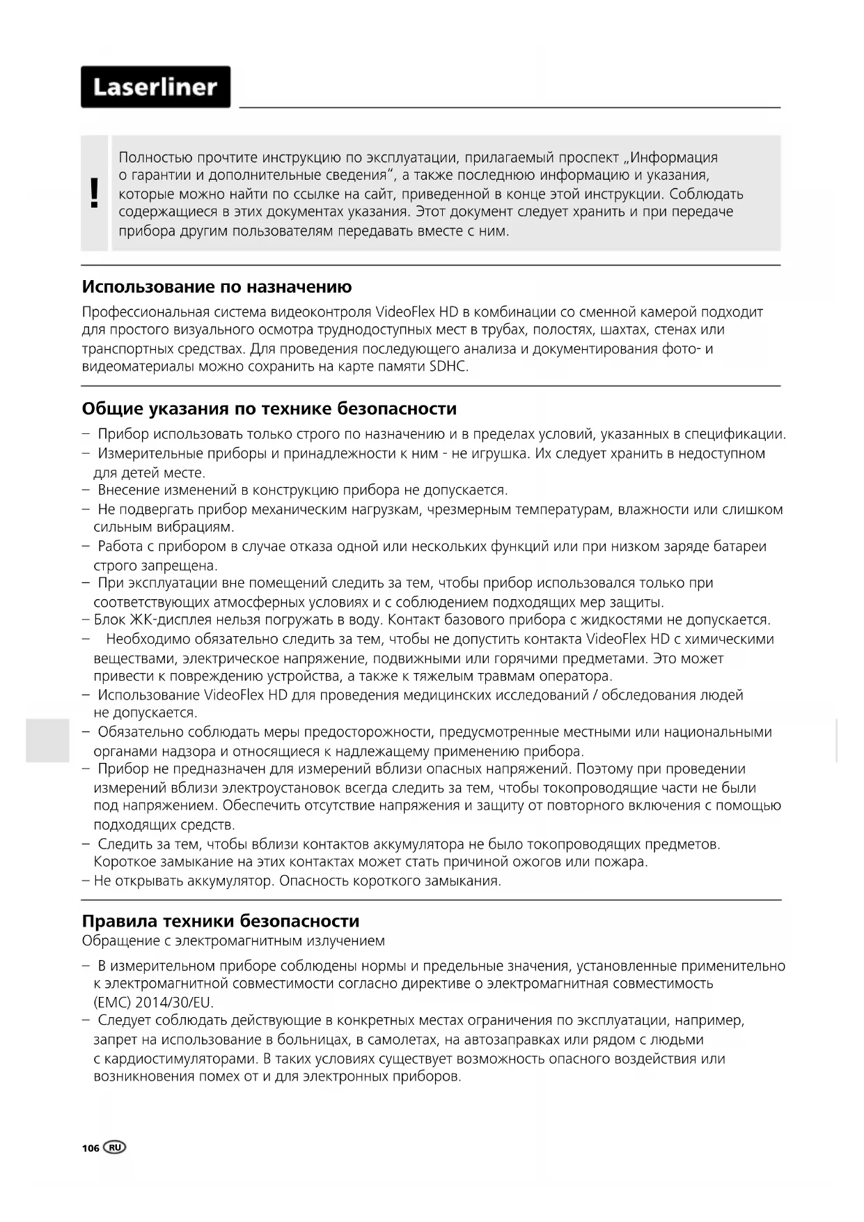 TRПравила техники безопасности Обращение с электромагнитным излучением – В измерительном приборе соблюдены нормы и предельные значения, установленные применительно к электромагнитной совместимости согласно директиве о электромагнитная совместимость (EMC) 2014/30/EU. – Следует соблюдать действующие в конкретных местах ограничения по эксплуатации, например, запрет на использование в больницах, в самолетах, на автозаправках или рядом с людьми с кардиостимуляторами. В таких условиях существует возможность опасного воздействия или возникновения помех от и для электронных приборов. Общие указания по технике безопасности – Прибор использовать только строго по назначению и в пределах условий, указанных в спецификации. – Измерительные приборы и принадлежности к ним - не игрушка. Их следует хранить в недоступном для детей месте. – Внесение изменений в конструкцию прибора не допускается. – Не подвергать прибор механическим нагрузкам, чрезмерным температурам, влажности или слишком сильным вибрациям. – Работа с прибором в случае отказа одной или нескольких функций или при низком заряде батареи строго запрещена. – При эксплуатации вне помещений следить за тем, чтобы прибор использовался только при соответствующих атмосферных условиях и с соблюдением подходящих мер защиты. – Блок ЖК-дисплея нельзя погружать в воду. Контакт базового прибора с жидкостями не допускается. – Необходимо обязательно следить за тем, чтобы не допустить контакта VideoFlex HD с химическими веществами, электрическое напряжение, подвижными или горячими предметами. Это может привести к повреждению устройства, а также к тяжелым травмам оператора. – Использование VideoFlex HD для проведения медицинских исследований / обследования людей не допускается. – Обязательно соблюдать меры предосторожности, предусмотренные местными или национальными органами надзора и относящиеся к надлежащему применению прибора. – Прибор не предназначен для измерений вблизи опасных напряжений. Поэтому при проведении измерений вблизи электроустановок всегда следить за тем, чтобы токопроводящие части не были под напряжением. Обеспечить отсутствие напряжения и защиту от повторного включения с помощью подходящих средств. – Следить за тем, чтобы вблизи контактов аккумулятора не было токопроводящих предметов. Короткое замыкание на этих контактах может стать причиной ожогов или пожара. – Не открывать аккумулятор. Опасность короткого замыкания. Использование по назначению Профессиональная система видеоконтроля VideoFlex HD в комбинации со сменной камерой подходит для простого визуального осмотра труднодоступных мест в трубах, полостях, шахтах, стенах или транспортных средствах. Для проведения последующего анализа и документирования фото- и видеоматериалы можно сохранить на карте памяти SDHC. Полностью прочтите инструкцию по эксплуатации, прилагаемый проспект „Информация о гарантии и дополнительные сведения“, а также последнюю информацию и указания, которые можно найти по ссылке на сайт, приведенной в конце этой инструкции. Соблюдать содержащиеся в этих документах указания. Этот документ следует хранить и при передаче прибора другим пользователям передавать вместе с ним.