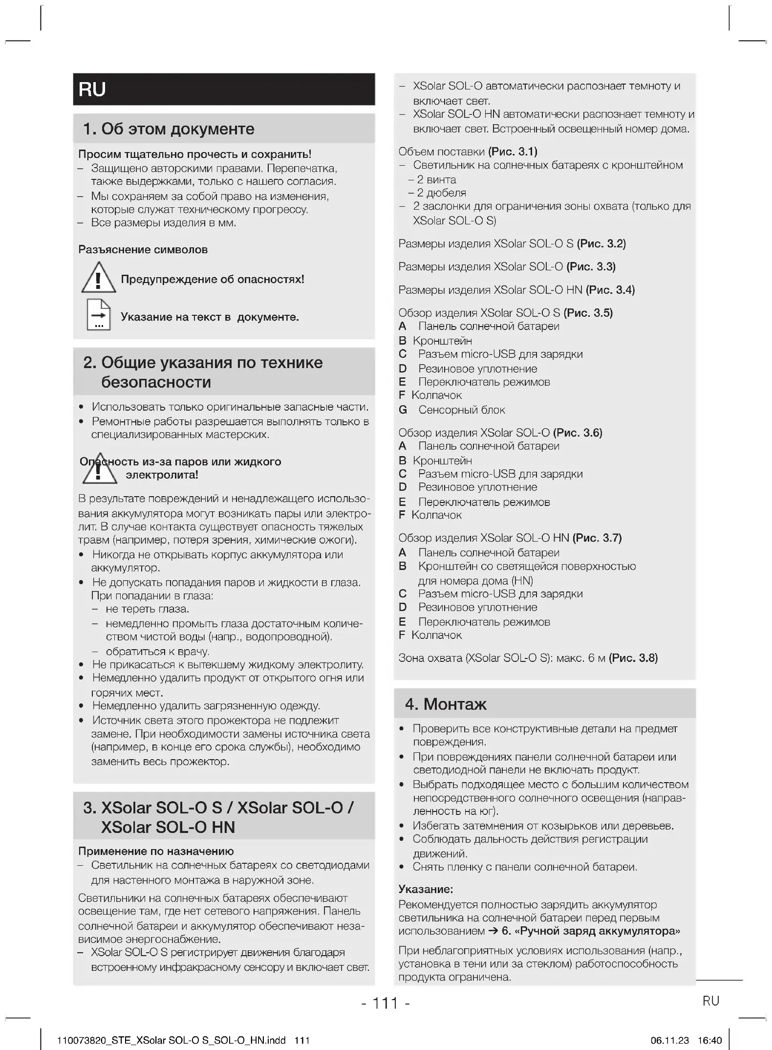110073820_STE_XSolar SOL-O S_SOL-O_HN.indd 110110073820_STE_XSolar SOL-O S_SOL-O_HN.indd 110 06.11.23 16:4006.11.23 16:40- 111 - – XSolarSOL-O автоматически распознает темноту и включает свет. – XSolarSOL-OHN автоматически распознает темноту и включает свет. Встроенный освещенный номер дома. Объем поставки (Pис 31) – Светильник на солнечных батареях с кронштейном – 2 винта – 2 дюбеля – 2 заслонки для ограничения зоны охвата (только для XSolarSOL-OS) Размеры изделия XSolarSOL-OS (Pис 32) Размеры изделия XSolarSOL-O (Pис 33) Размеры изделия XSolarSOL-OHN (Pис 34) Обзор изделия XSolar SOL-O S (Pис 35) A Панель солнечной батареи B Кронштейн C Разъем micro-USB для зарядки D Резиновое уплотнение Е Переключатель режимов F Колпачок G Сенсорный блок Обзор изделия XSolarSOL-O (Pис 36) A Панель солнечной батареи B Кронштейн C Разъем micro-USB для зарядки D Резиновое уплотнение Е Переключатель режимов F Колпачок Обзор изделия XSolarSOL-OHN (Pис 37) A Панель солнечной батареи B Кронштейн со светящейся поверхностью для номера дома (HN) C Разъем micro-USB для зарядки D Резиновое уплотнение Е Переключатель режимов F Колпачок Зона охвата (XSolarSOL-OS): макс. 6м (Pис 38) 4 Монтаж