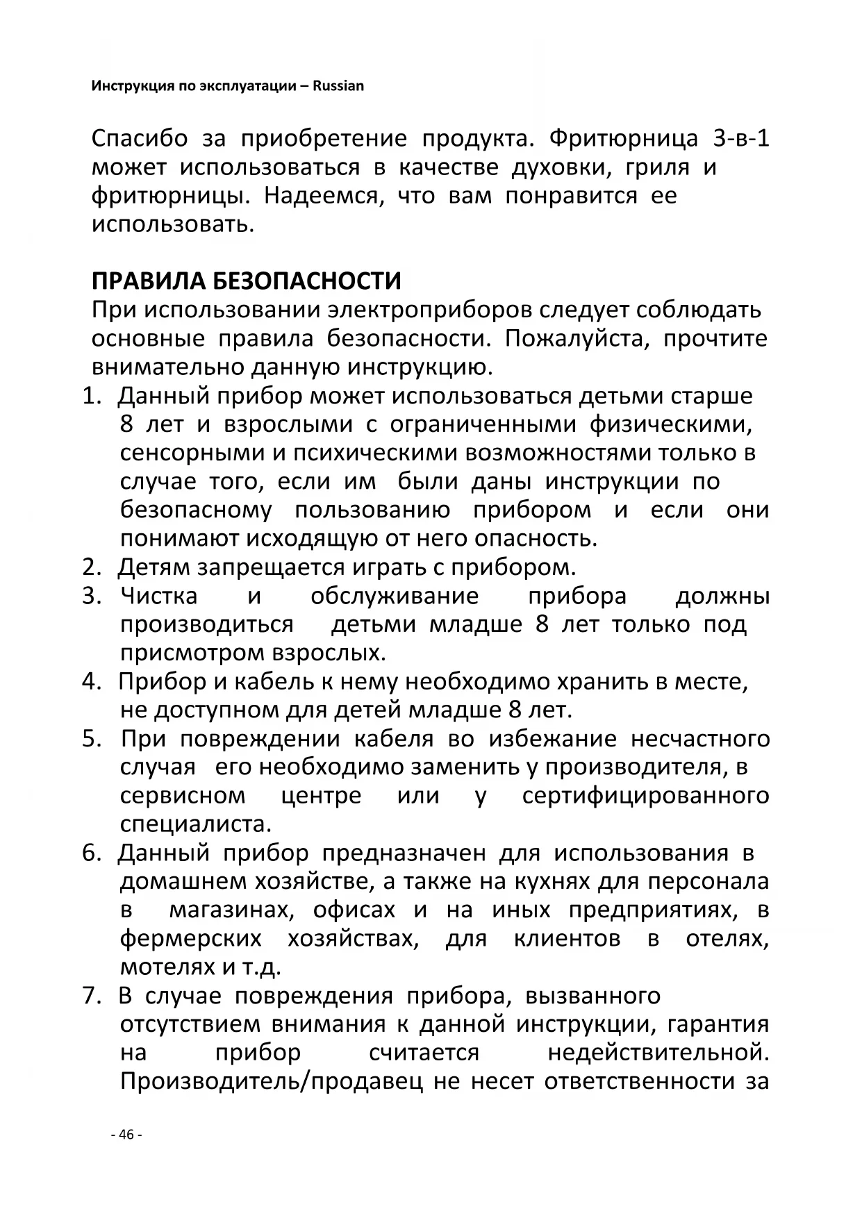 ПЕРЕД ИСПОЛЬЗОВАНИЕМ ПРИБОРА: Прочитайте данную инструкцию и сохраните ее для дальнейшего использования. Подключайте прибор только к заземленной розетке. Перед первым использованием убедитесь, что все элементы упаковки с прибора убраны. Очистите корзину и решетку для гриля (см. раздел "Чистка и техническое обслуживание"). Протрите прибор внутри и снаружи мягкой тканью. Убедитесь, что электрические части прибора сухие. Прибор будет нагревать продукты со всех сторон, поэтому для приготовления вам не понадобится масло. Перед первым использованием включите прибор примерно на 10 минут, чтобы выжечь остатки заводской смазки. Убедитесь, что в помещении хорошая вентиляция. При первом включении прибор может испускать дым и характерный запах. Это нормально и скоро пройдет. Примечание: всегда используйте решетку для гриля с силиконовыми вставками. Они будут поддерживать решетку в корзине в нужном положении во время приготовления. ИСПОЛЬЗОВАНИЕ ПРИБОРА: