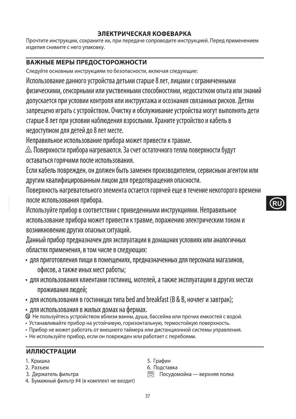 Jotta vältettäisiin vaarallisista aineista ympäristölle ja terveydelle koituvat haitat, näillä symboleilla varustettuja laitteita sekä ladattavia ja kertakäyttöisiä paristoja ei saa hävittää lajittelemattomana sekajätteenä. Hävitä sähkö- ja elektroniikkatuotteet sekä, mikäli sovellettavissa, ladattavat ja kertakäyttöiset paristot asianmukaiseen viralliseen kierrätys-/keräilypisteeseen.37 ЭЛЕКТРИЧЕСКАЯ КОФЕВАРКА Прочтите инструкции, сохраните их, при передаче сопроводите инструкцией. Перед применением изделия снимите с него упаковку. ВАЖНЫЕ МЕРЫ ПРЕДОСТОРОЖНОСТИ Следуйте основным инструкциям по безопасности, включая следующие: Использование данного устройства детьми старше 8 лет, лицами с ограниченными физическими, сенсорными или умственными способностями, недостатком опыта или знаний допускается при условии контроля или инструктажа и осознания связанных рисков. Детям запрещено играть с устройством. Очистку и обслуживание устройства могут выполнять дети старше 8 лет при условии наблюдения взрослыми. Храните устройство и кабель в недоступном для детей до 8 лет месте. Неправильное использование прибора может привести к травме. h Поверхности прибора нагреваются. За счет остаточного тепла поверхности будут оставаться горячими после использования. Если кабель поврежден, он должен быть заменен производителем, сервисным агентом или другим квалифицированным лицом для предотвращения опасности. Поверхность нагревательного элемента остается горячей еще в течение некоторого времени после использования прибора. Используйте прибор в соответствии с приведенными инструкциями. Неправильное использование прибора может привести к травме, поражению электрическим током и возникновению других опасных ситуаций. Данный прибор предназначен для эксплуатации в домашних условиях или аналогичных областях применения, в том числе в следующих: