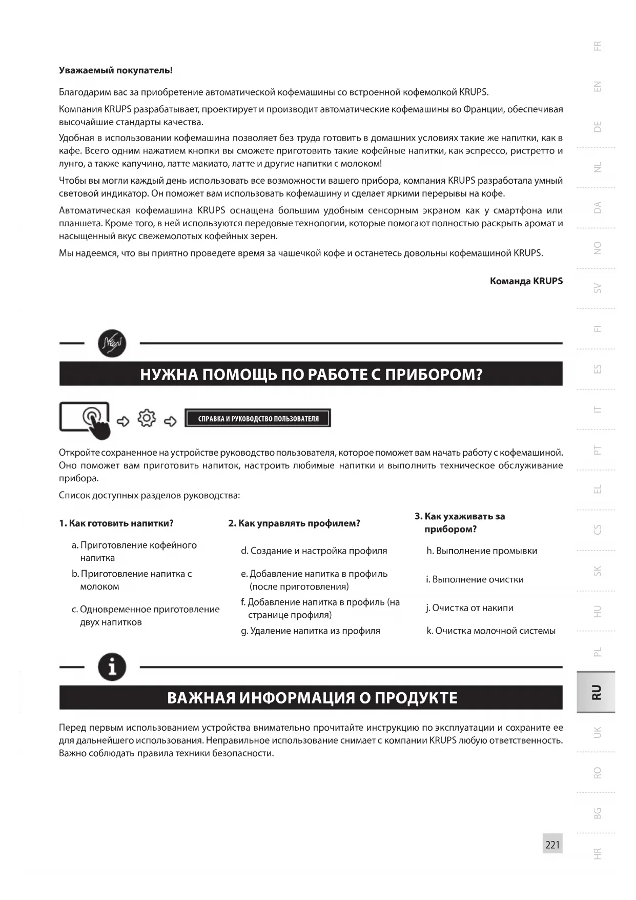 c. Одновременное приготовление двух напитков f. Добавление напитка в профиль (на странице профиля) j. Очистка от накипи g. Удаление напитка из профиля k. Очистка молочной системы ВАЖНАЯ ИНФ ОРМАЦИЯ О ПРОДУКТЕ Перед первым использованием устройства внимательно прочитайте инструкцию по эксплуатации и сохраните ее для дальнейшего использования. Неправильное использование снимает с компании KRUPS любую ответственность. Важно соблюдать правила техники безопасности.223222