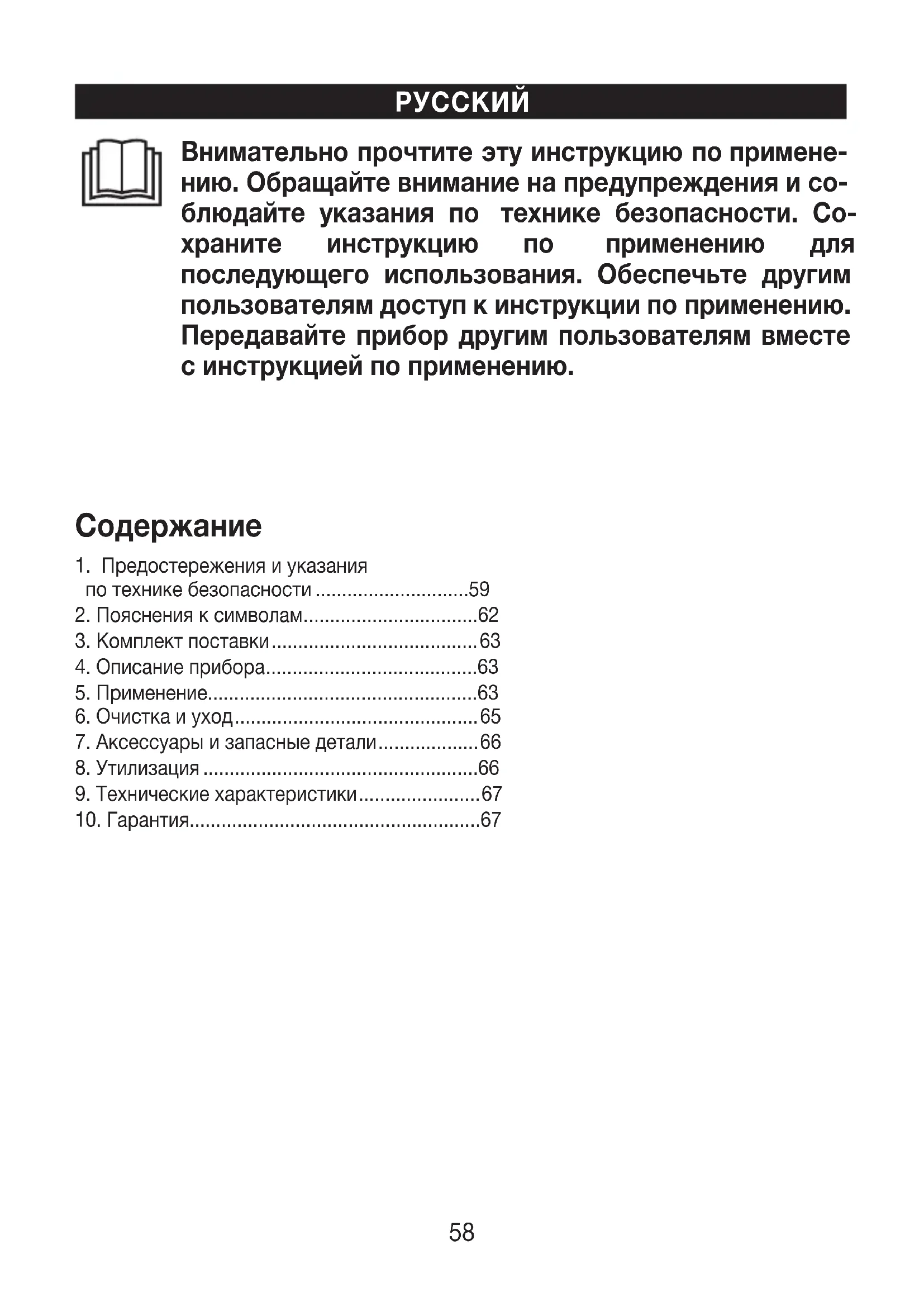 - Опасность поражения электрическим током! Категорически запрещается использовать прибор или его принадлежности при видимых повреждениях.61