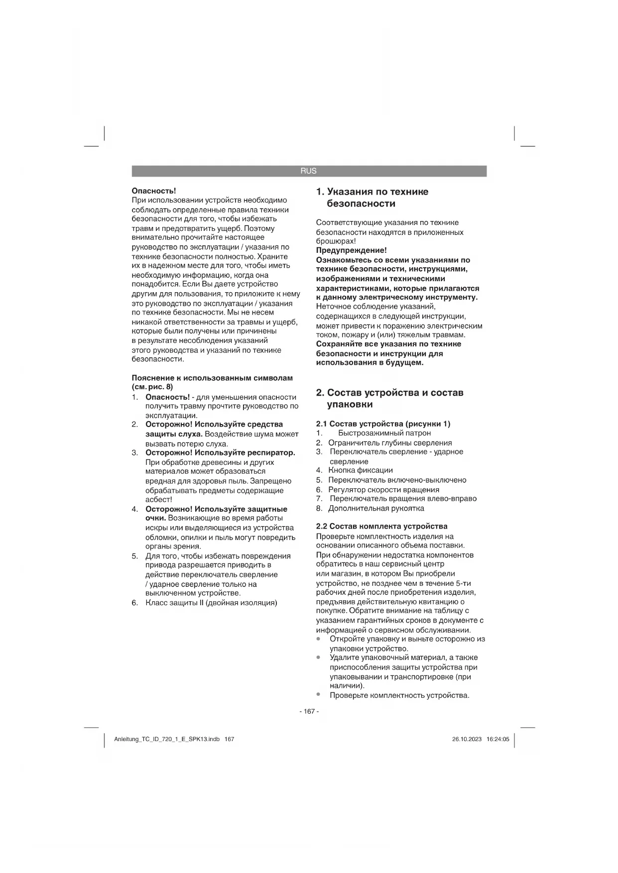 Если будет поврежден кабель питания от электросети этого устройства, то его должен заменить изготовитель устройства, его служба сервиса или другое лицо с подобной квалификацией для того, чтобы избежать опасностей. Anleitung_TC_ID_720_1_E_SPK13.indb 171Anleitung_TC_ID_720_1_E_SPK13.indb 171 26.10.2023 16:24:0626.10.2023 16:24:06RUS