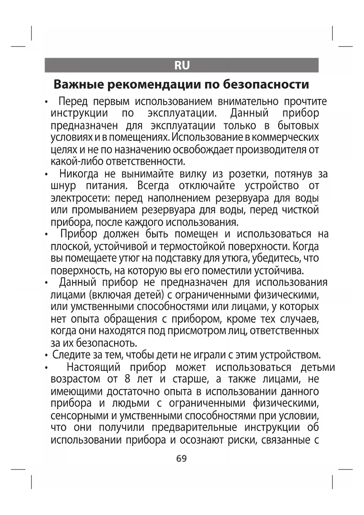 - Настоящий прибор может использоваться детьми возрастом от 8 лет и старше, а также лицами, не имеющими достаточно опыта в использовании данного прибора и людьми с ограниченными физическими, сенсорными и умственными способностями при условии, что они получили предварительные инструкции об использовании прибора и осознают риски, связанные с 69ним. Не давайте детям играть с прибором. Не разрешайте детям чистить и обслуживать прибор без присмотра. Держите горячий или включенный в сеть утюг и провод вне досягаемости для детей младше 8 лет.