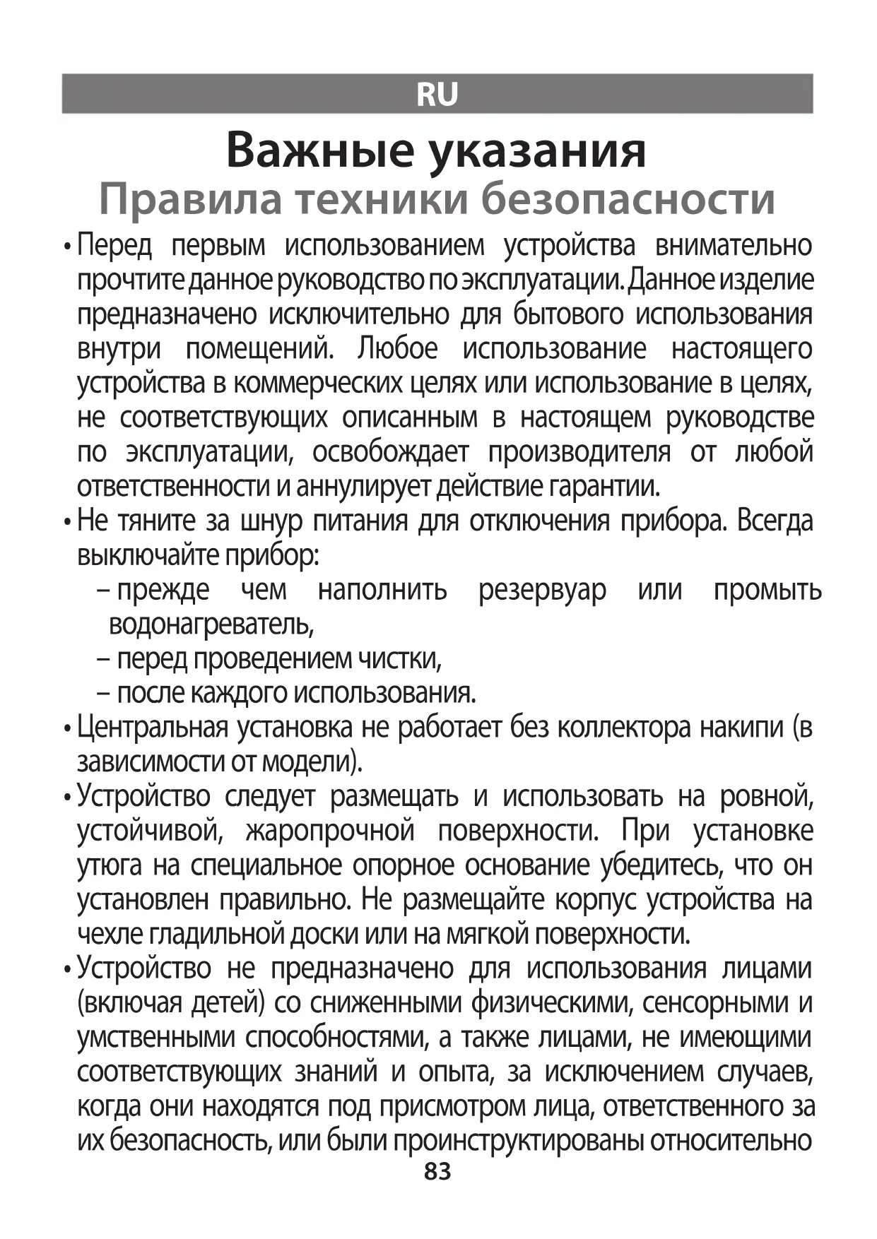 - Данным устройством могут пользоваться дети старше 8 лет, а также люди, у которых отсутствуют соответствующий опыт и знания, или люди с ограниченными физическими, сенсорными или психическими способностями, в случае, если они получили инструкции относительно безопасной эксплуатации устройства и осознают связанные с его эксплуатацией риски. Дети не должны играть с прибором. Запрещается доверять чистку или обслуживание устройства детям без присмотра взрослых. Держите утюг и шнур питания (особенно если утюг включен в розетку или выключен, но еще не остыл) вне зоны доступа детей младше 8 лет.