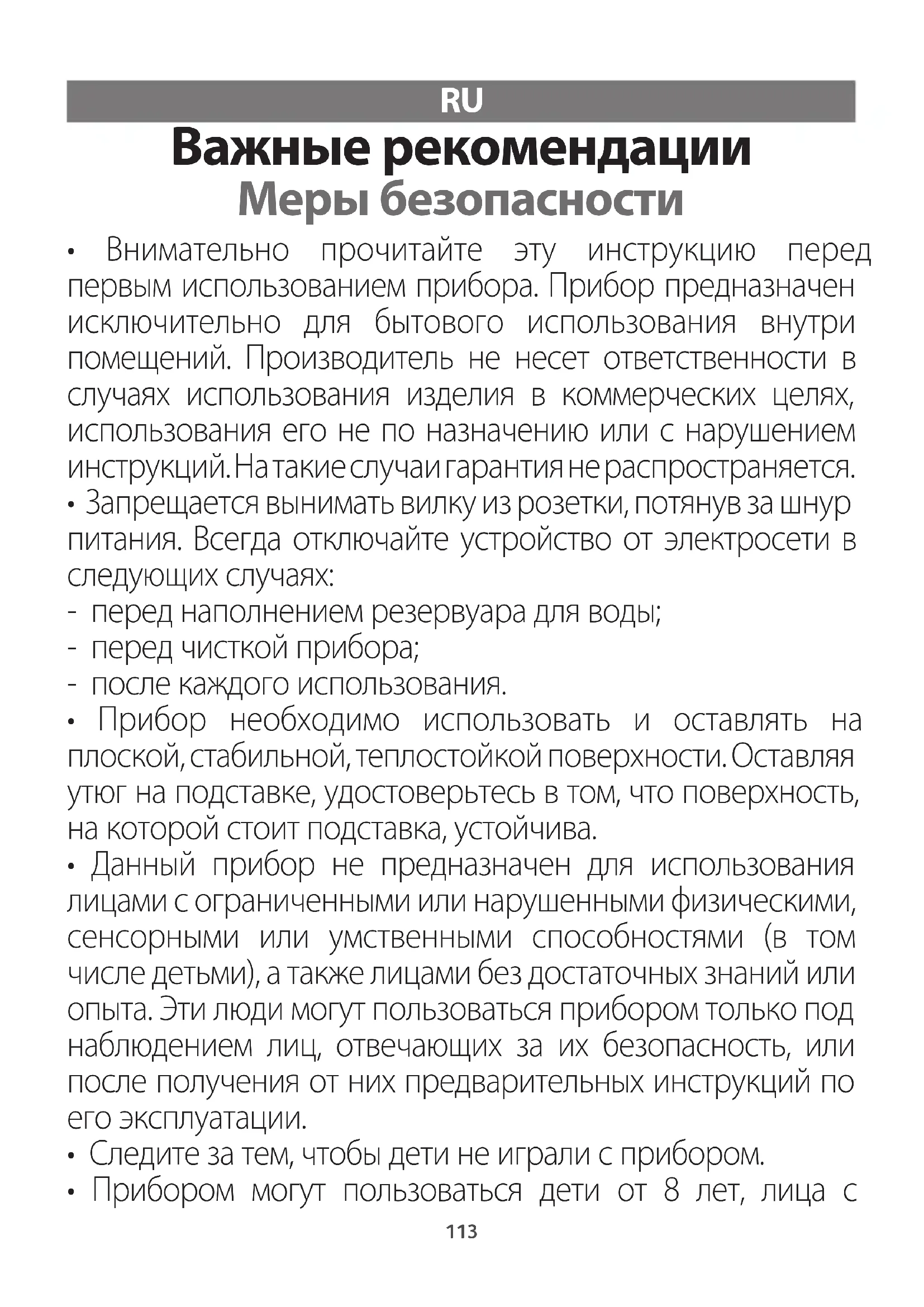- Прибором могут пользоваться дети от 8 лет, лица с114 недостаточным опытом и знаниями, а также лица с ограниченными или нарушенными физическими, сенсорными или умственными возможностями, находясь под наблюдением лиц, ответственных за их безопасность, получив от них предварительные инструкции относительно использования прибора и возможных рисков. Детям запрещается играть с прибором. Чистка и уход за прибором могут осуществляться детьми только под присмотром взрослых. Держите горячий или включенный в сеть утюг и провод вне досягаемости для детей младше 8 лет.