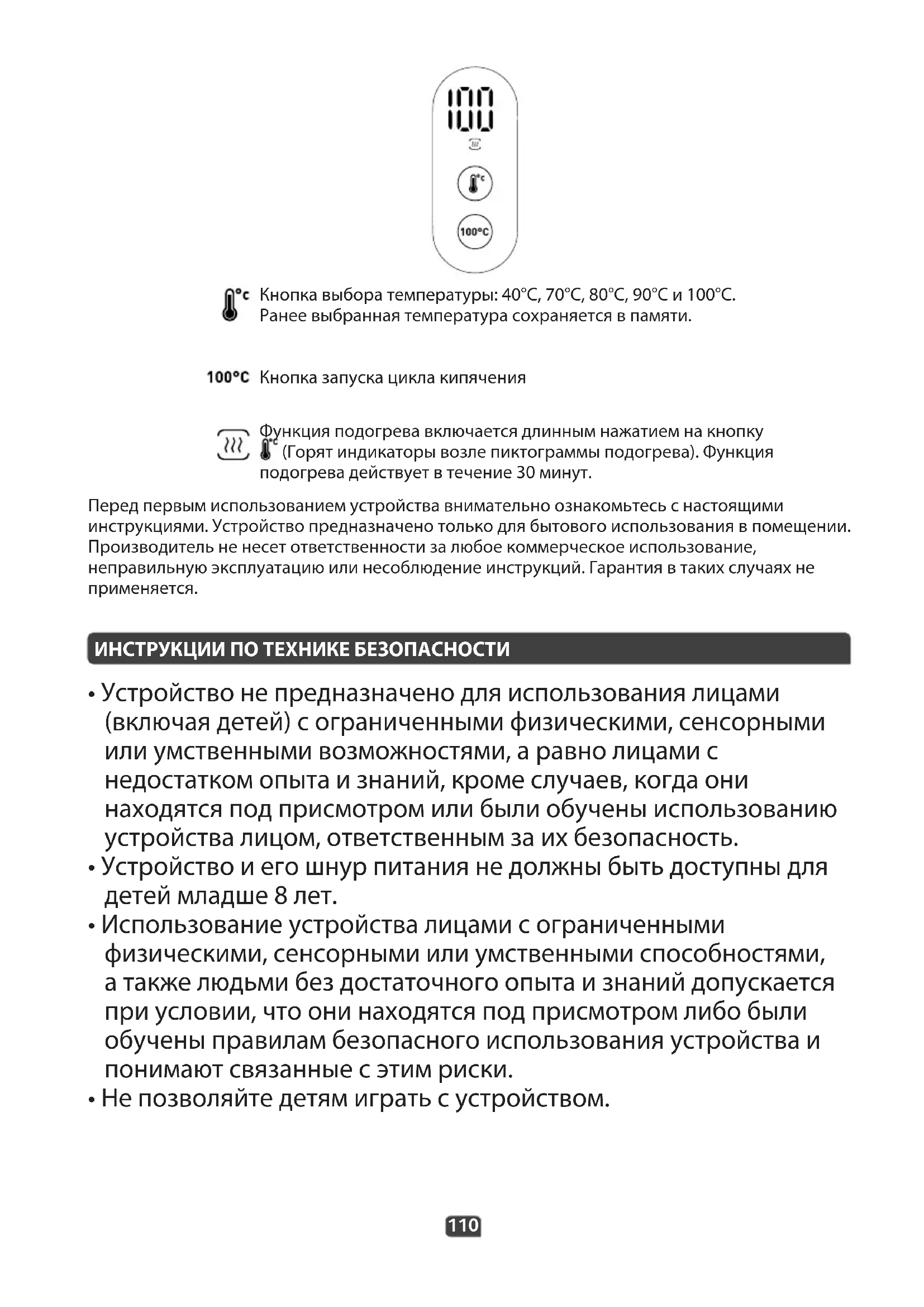 - Не позволяйте детям играть с устройством. ИНСТРУКЦИИ ПО ТЕХНИКЕ БЕЗОПАСНОСТИ Кнопка выбора температуры: 40°C, 70°C, 80°C, 90°C и 100°C. Ранее выбранная температура сохраняется в памяти. Кнопка запуска цикла кипячения Функция подогрева включается длинным нажатием на кнопку (Горят индикаторы возле пиктограммы подогрева). Функция подогрева действует в течение 30минут. Перед первым использованием устройства внимательно ознакомьтесь с настоящими инструкциями. Устройство предназначено только для бытового использования в помещении. Производитель не несет ответственности за любое коммерческое использование, неправильную эксплуатацию или несоблюдение инструкций. Гарантия в таких случаях не применяется.111
