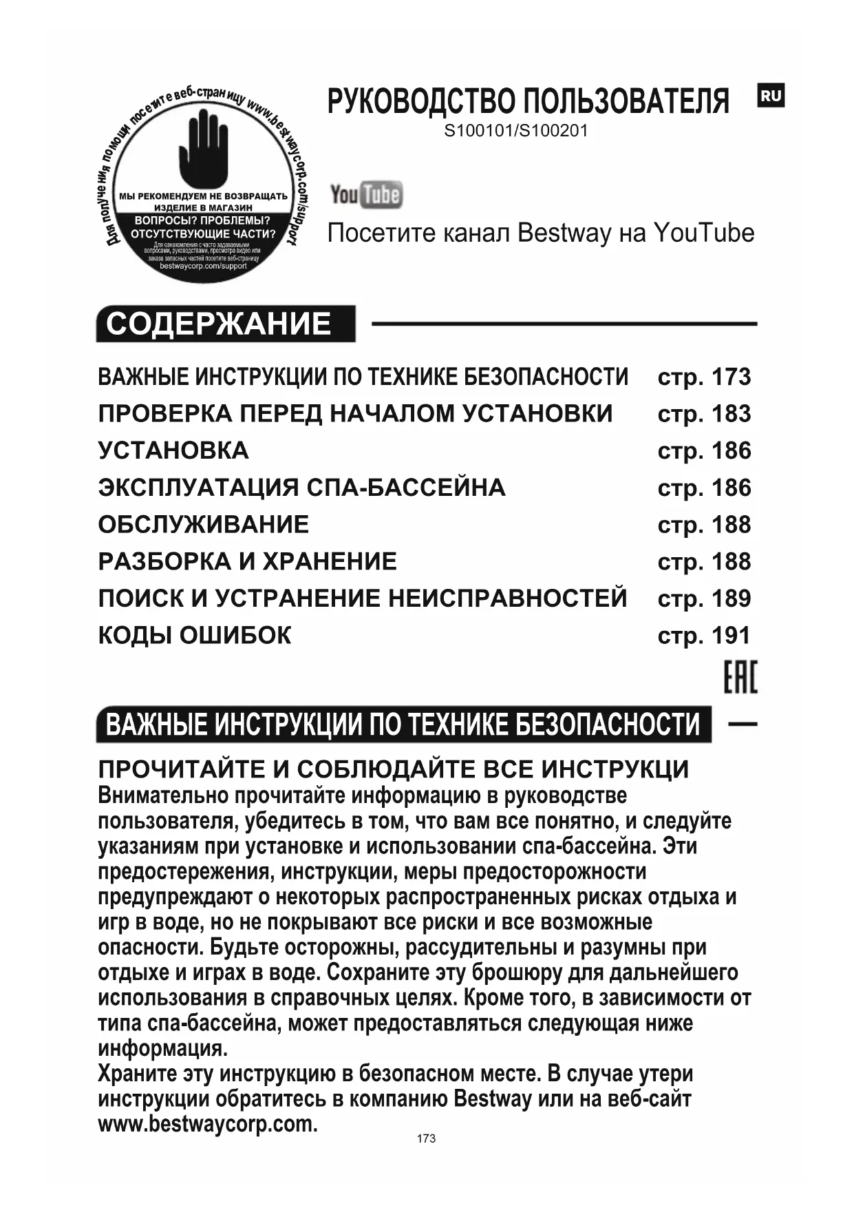 - Не используйте насос, если этот тест не был выполнен, либо его результат негативен. Для получения помощи посетите раздел поддержки на нашем веб-сайте www.bestwaycorp.com. СОХРАНИТЕ ЭТИ ИНСТРУКЦИИ Посетите канал Bestway на YouTube РУКОВОДСТВО ПОЛЬЗОВАТЕЛЯ S100101/S100201 МЫ РЕКОМЕНДУЕМ НЕ ВОЗВРАЩАТЬИЗДЕЛИЕ В МАГАЗИНВОПРОСЫ? ПРОБЛЕМЫ?ОТСУТСТВУЮЩИЕ ЧАСТИ? Для ознакомления с часто задаваемыми вопросами, руководствами, просмотра видео или заказа запасных частей посетите веб-страницу bestwaycorp.com/support
