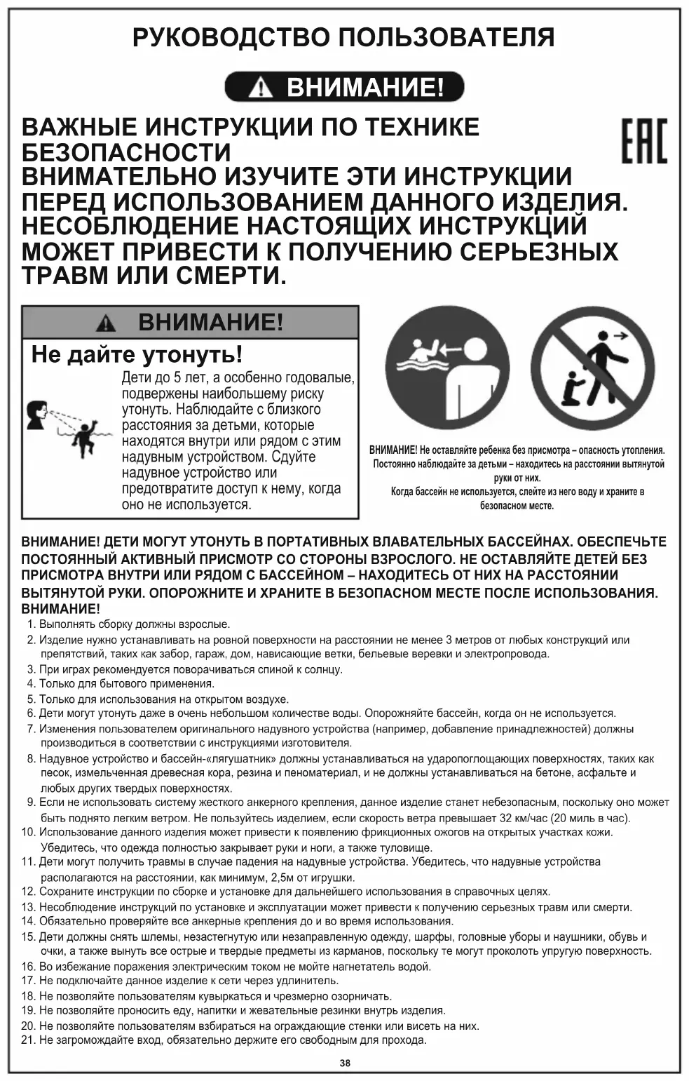 Не дайте утонуть! Дети до 5 лет, а особенно годовалые, подвержены наибольшему риску утонуть. Наблюдайте с близкого расстояния за детьми, которые находятся внутри или рядом с этим надувным устройством. Сдуйте надувное устройство или предотвратите доступ к нему, когда оно не используется.