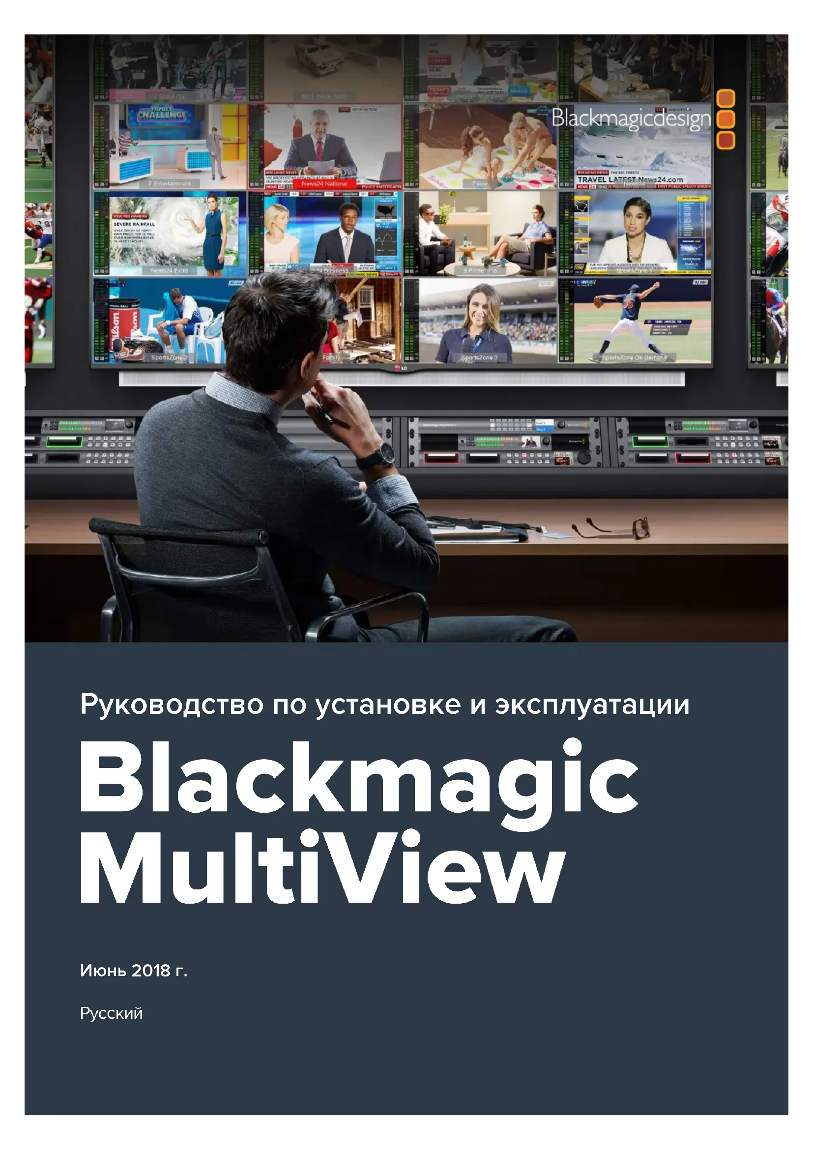 Июнь 2018 г. Руководство по установке и эксплуатации Blackmagic MultiViewДобро пожаловать! Благодарим вас за покупку Blackmagic MultiView. Мы стремимся к тому, чтобы телевидение стало по-настоящему творческим процессом, вкотором любой профессионал имеет возможность создавать материал самого высокого качества. MultiView 16 обеспечивает мониторинг сигнала до 16 разных источников на одном экране доступных Ultra HD-телевизоров. Модель Blackmagic MultiView 4 идеально подходит для небольших или мобильных студий производства, позволяя выводить до четырех источников на HD- или Ultra HD-дисплей. При необходимости можно также создать собственную конфигурацию, объединив несколько устройств MultiView в одну цепь. Это руководство содержит всю информацию, необходимую для работы с BlackmagicMultiView. Если вы не знаете, как задавать IP-адрес и сетевые параметры, мы рекомендуем обратиться за помощью к техническому специалисту. Для управления устройством можно использовать приложение Blackmagic Videohub Control, однако после его установки потребуется выполнить определенную настройку. Чтобы загрузить последнюю версию руководства и программного приложения, посетите раздел поддержки на нашем сайте www.blackmagicdesign.com/ru. При загрузке обновления для Blackmagic MultiView не забудьте зарегистрироваться, итогда мы будем сообщать вам о выпуске очередного релиза. Мы постоянно работаем над совершенствованием наших продуктов, поэтому ваши отзывы помогут нам сделать их еще лучше. Мы надеемся, что Blackmagic MultiView прослужит вам много лет и станет надежным помощником в студии для мониторинга в Ultra HD! Grant Petty Генеральный директор Blackmagic DesignBlackmagic MultiView
