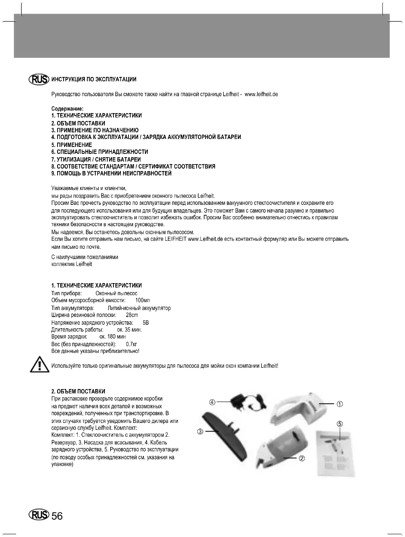 Уважаемыеклиентыиклиентки, мырадыпоздравитьВассприобретениемоконногопылесосаLeifheit. ПросимВаспрочестьруководствопоэксплуатациипередиспользованиемвакуумногостеклоочистителяисохранитеего дляпоследующегоиспользованияилидлябудущихвладельцев.ЭтопоможетВамссамогоначаларазумноиправильно эксплуатироватьстеклоочистительипозволитизбежатьошибок.ПросимВасособенновнимательноотнестиськправилам техникибезопасностивнастоящемруководстве. Мынадеемся,Выостанетесьдовольныоконнымпылесосом. ЕслиВыхотитеотправитьнамписьмо,насайтеLEIFHEITwww.Leifheit.deестьконтактныйформулярилиВыможетеотправить намписьмопопочте. Снаилучшимипожеланиями коллективLeifheit 1.ТЕХНИЧЕСКИЕХАРАКТЕРИСТИКИ Типприбора: Оконныйпылесос Объеммусоросборнойемкости: 100мл Типаккумулятора: Литий-ионныйаккумулятор Ширинарезиновойполоски: 28cm Напряжениезарядногоустройства: 5В Длительностьработы: ок.35мин. Времязарядки: ок.180мин Вес(безпринадлежностей): 0.7кг Вседанныеуказаныприблизительно! ИспользуйтетолькооригинальныеаккумуляторыдляпылесосадлямойкиоконкомпанииLeifheit! 2.ОБЪЕМПОСТАВКИ Прираспаковкепроверьтесодержимоекоробки напредметналичиявсехдеталейивозможных повреждений,полученныхпритранспортировке.В этихслучаяхтребуетсяуведомитьВашегодилераили сервиснуюслужбуLeifheit.Комплект: Комплект:1.Стеклоочистительсаккумулятором2. Резервуар,3.Насадкадлявсасывания,4.Кабель зарядногоустройства,5.Руководствопоэксплуатации (поповодуособыхпринадлежностейсм.указанияна