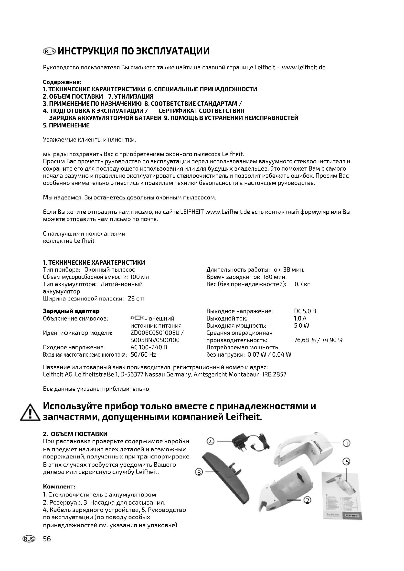 Название или товарный знак производителя, регистрационный номер и адрес: Leifheit AG, Leifheitstraße 1, D-56377 Nassau Germany, Amtsgericht Montabaur HRB 2857 Все данные указаны приблизительно! Используйте прибор только вместе с принадлежностями и запчастями, допущенными компанией Leifheit. Тип прибора: Оконный пылесос Объем мусоросборной емкости: 100 мл Тип аккумулятора: Литий-ионный аккумулятор Ширина резиновой полоски: 28 cm Длительность работы: ок. 38 мин. Время зарядки: ок. 180 мин. Вес (без принадлежностей): 0.7 кг Зарядный адаптер Объяснение символов: