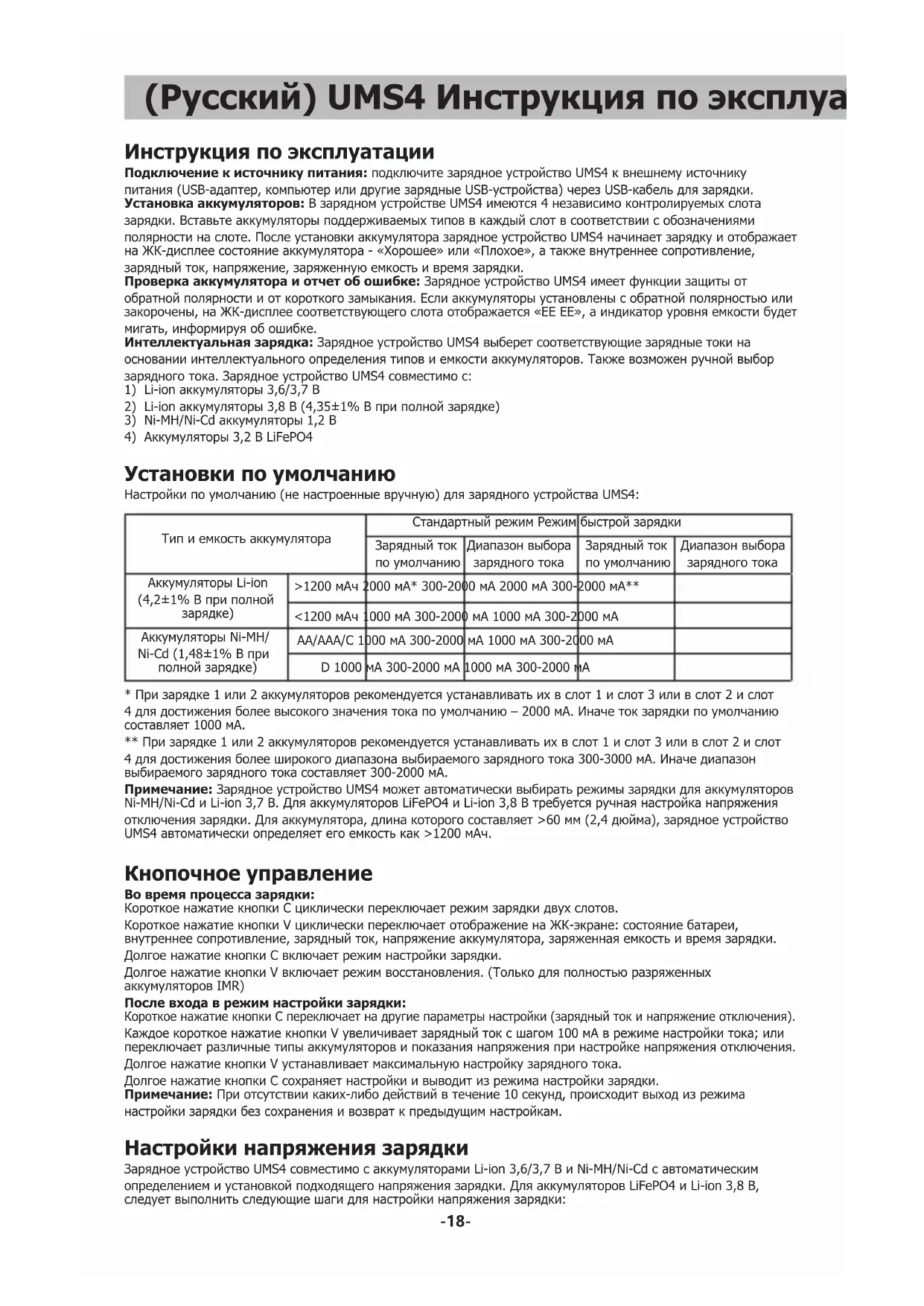 - При зарядке 1 или 2 аккумуляторов рекомендуется устанавливать их в слот 1 и слот 3 или в слот 2 и слот 4 для достижения более высокого значения тока по умолчанию – 2000 мА. Иначе ток зарядки по умолчанию составляет 1000 мА. ** При зарядке 1 или 2 аккумуляторов рекомендуется устанавливать их в слот 1 и слот 3 или в слот 2 и слот 4 для достижения более широкого диапазона выбираемого зарядного тока 300-3000 мА. Иначе диапазон выбираемого зарядного тока составляет 300-2000 мА. Примечание: Зарядное устройство UMS4 может автоматически выбирать режимы зарядки для аккумуляторов Ni-MH/Ni-Cd и Li-ion 3,7 В. Для аккумуляторов LiFePO4 и Li-ion 3,8 В требуется ручная настройка напряжения отключения зарядки. Для аккумулятора, длина которого составляет >60 мм (2,4 дюйма), зарядное устройство UMS4 автоматически определяет его емкость как >1200 мАч. Кнопочноеуправление Вовремяпроцессазарядки: Короткое нажатие кнопки C циклически переключает режим зарядки двух слотов. Короткое нажатие кнопки V циклически переключает отображение на ЖК-экране: состояние батареи, внутреннее сопротивление, зарядный ток, напряжение аккумулятора, заряженная емкость и время зарядки. Долгое нажатие кнопки C включает режим настройки зарядки. Долгое нажатие кнопки V включает режим восстановления. (Только для полностью разряженных аккумуляторов IMR) Послевходаврежимнастройкизарядки: Короткое нажатие кнопки C переключает на другие параметры настройки (зарядный ток и напряжение отключения). Каждое короткое нажатие кнопки V увеличивает зарядный ток с шагом 100 мА в режиме настройки тока; или переключает различные типы аккумуляторов и показания напряжения при настройке напряжения отключения. Долгое нажатие кнопки V устанавливает максимальную настройку зарядного тока. Долгое нажатие кнопки C сохраняет настройки и выводит из режима настройки зарядки. Примечание: При отсутствии каких-либо действий в течение 10 секунд, происходит выход из режима настройки зарядки без сохранения и возврат к предыдущим настройкам. Настройкинапряжениязарядки Зарядное устройство UMS4 совместимо с аккумуляторами Li-ion 3,6/3,7 В и Ni-MH/Ni-Cd с автоматическим определением и установкой подходящего напряжения зарядки. Для аккумуляторов LiFePO4 и Li-ion 3,8 В, следует выполнить следующие шаги для настройки напряжения зарядки:-19- (Русский)UMS4Инструкцияпоэксплуатации