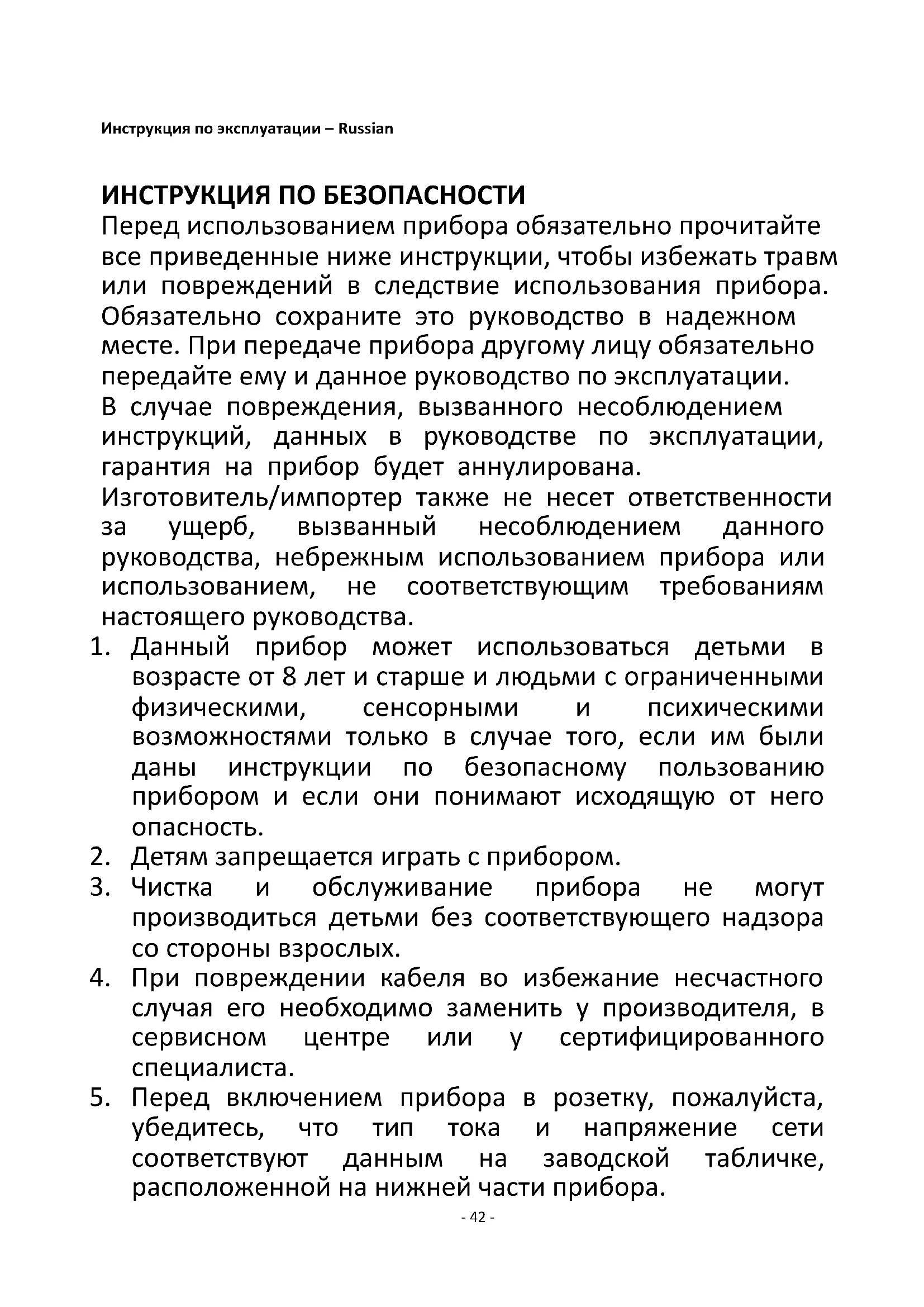Informacje dla konsumentów na temat sposobu instalacji, użytkowania i konserwacji produktu oraz informacje na temat WEEE podano w instrukcji znajdującej się w opakowaniu.- 42 - Инструкция по эксплуатации – Russian ИНСТРУКЦИЯ ПО БЕЗОПАСНОСТИ Перед использованием прибора обязательно прочитайте все приведенные ниже инструкции, чтобы избежать травм или повреждений в следствие использования прибора. Обязательно сохраните это руководство в надежном месте. При передаче прибора другому лицу обязательно передайте ему и данное руководство по эксплуатации. В случае повреждения, вызванного несоблюдением инструкций, данных в руководстве по эксплуатации, гарантия на прибор будет аннулирована. Изготовитель/импортер также не несет ответственности за ущерб, вызванный несоблюдением данного руководства, небрежным использованием прибора или использованием, не соответствующим требованиям настоящего руководства.