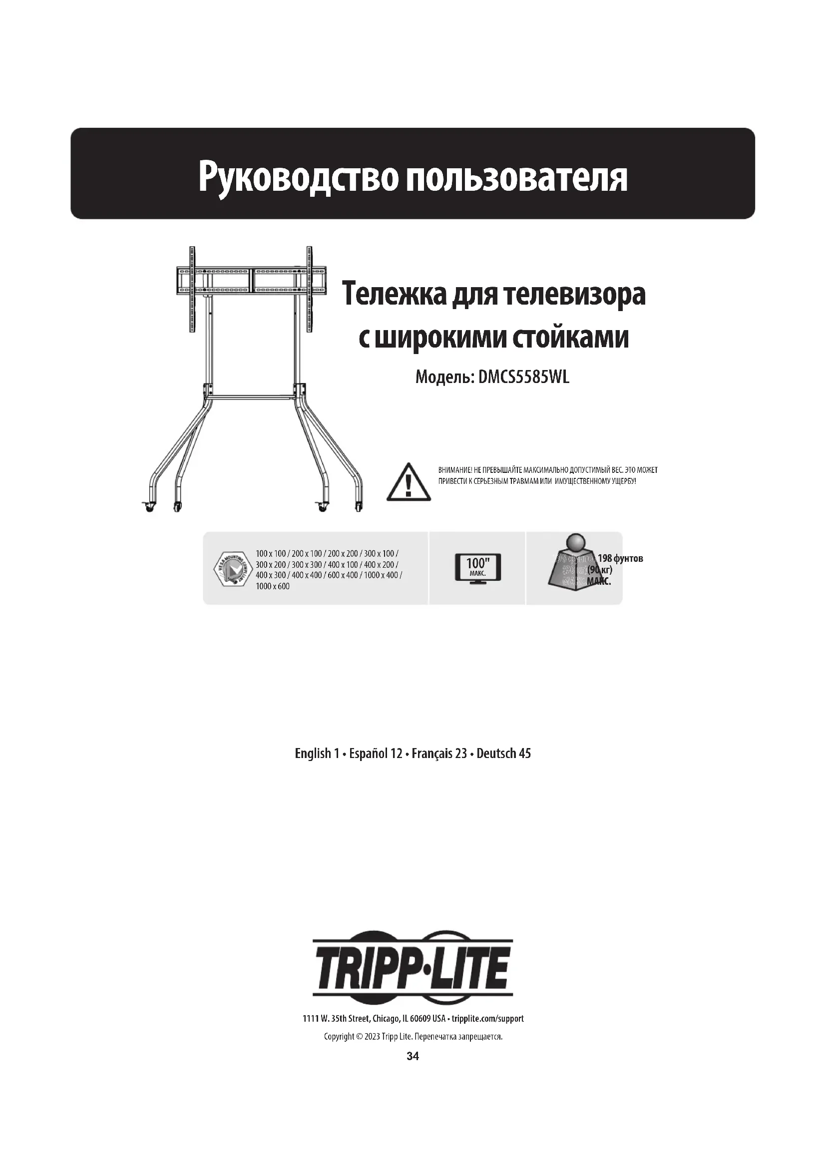 Скачайте инструкцию для вашего ТВ мебель в формате PDF бесплатно! Найдите своё руководство DMCS5585WL - Tripp Lite и возьмите своё электронное устройство обратно в руки. На этой странице опубликованы все документы, необходимые для использования вашего устройства. DMCS5585WL бренда Tripp Lite.