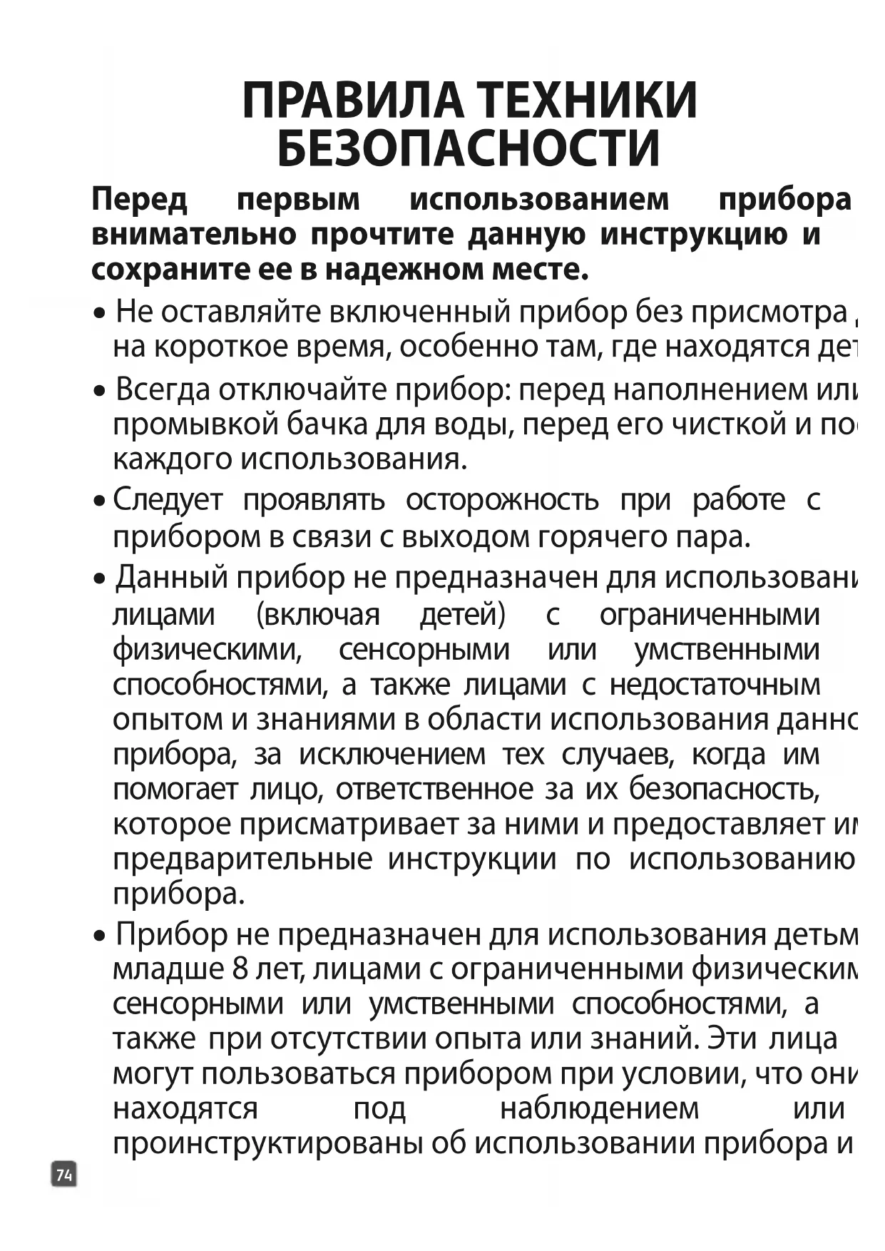 - Данный прибор не предназначен для использования лицами (включая детей) с ограниченными физическими, сенсорными или умственными способностями, а также лицами с недостаточным опытом и знаниями в области использования данного прибора, за исключением тех случаев, когда им помогает лицо, ответственное за их безопасность, которое присматривает за ними и предоставляет им предварительные инструкции по использованию