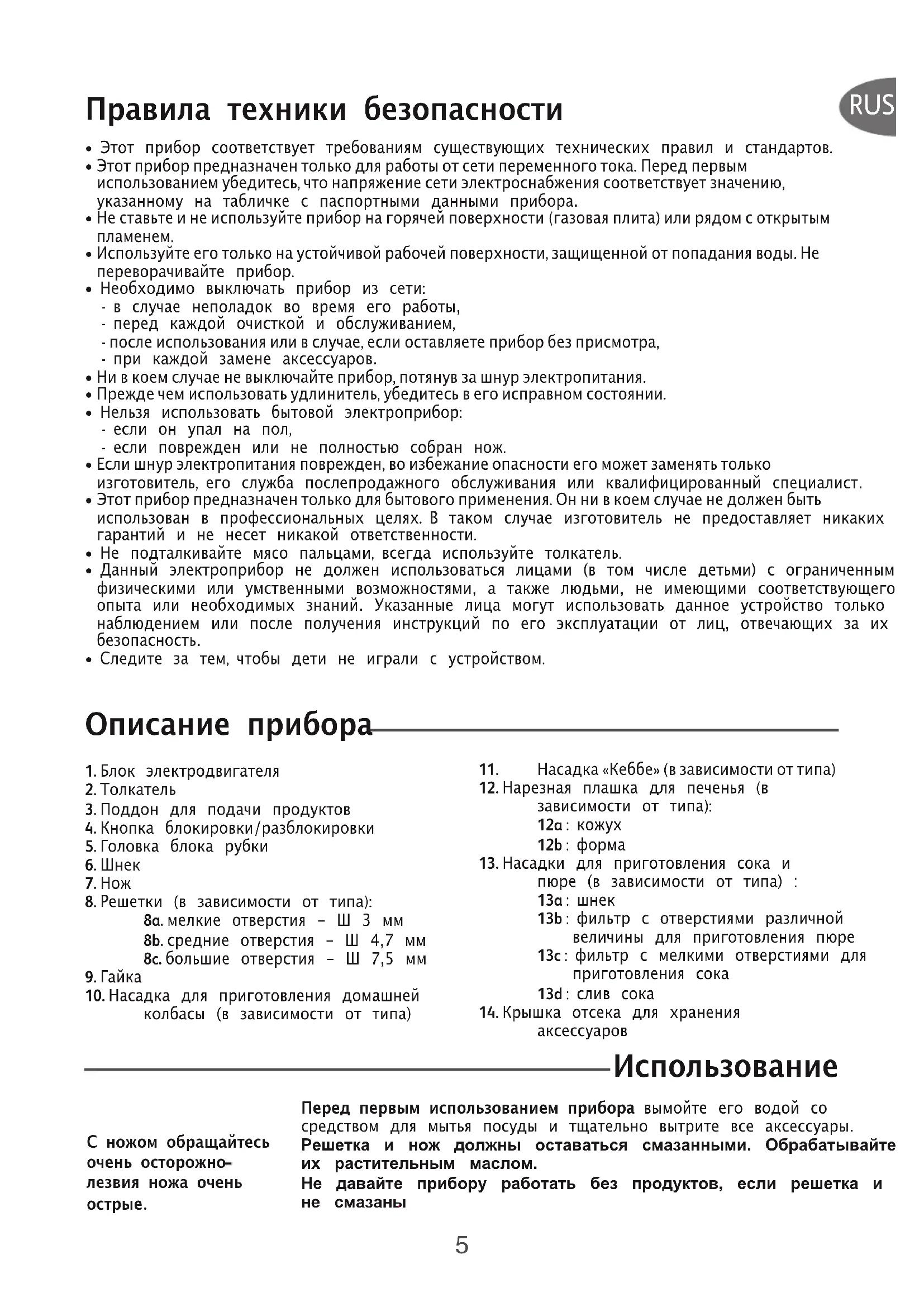 аксессуаров Использование Перед первым использованием прибора вымойте его водой со средством для мытья посуды и тщательно вытрите все аксессуары. Решетка и нож должны оставаться смазанными. Обрабатывайте их растительным маслом. Не давайте прибору работать без продуктов, если решетка и нож
