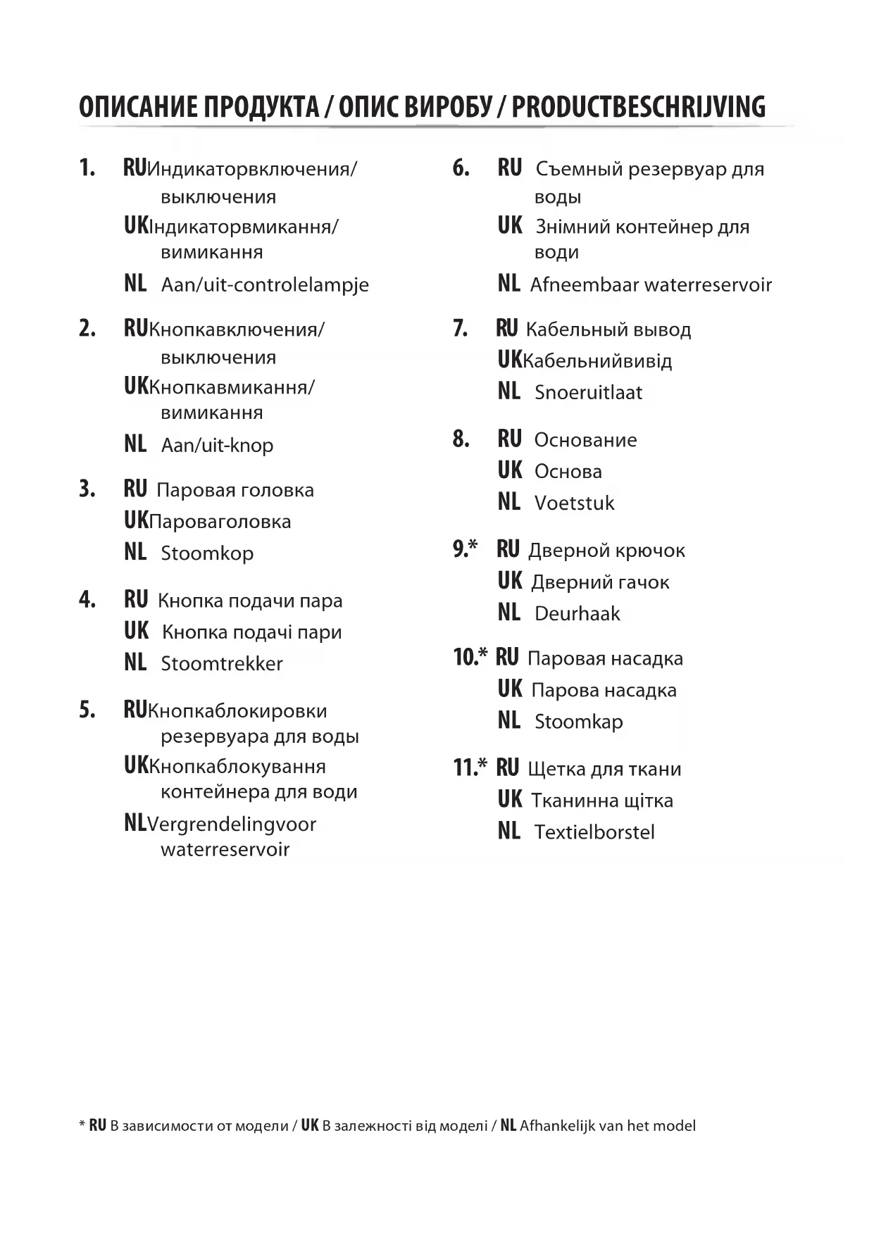 UK Основа NL Voetstuk 9.* RU Дверной крючок UK Дверний гачок NL Deurhaak 10.* RU Паровая насадка UK Парова насадка NL Stoomkap 11.* RU Щетка для ткани UK Тканинна щітка NL Textielborstel