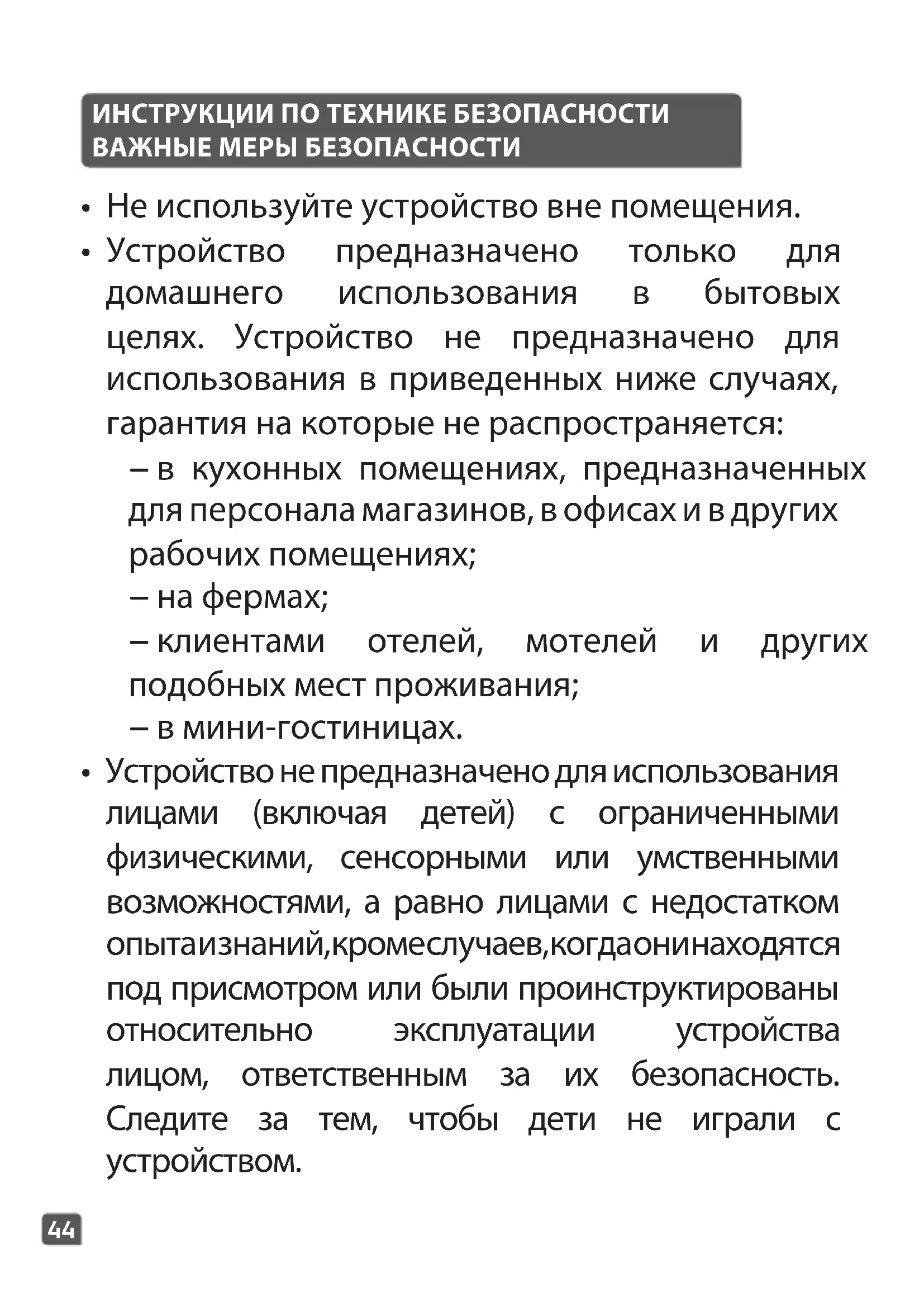 - Устройство предназначено только для домашнего использования в бытовых целях. Устройство не предназначено для использования в приведенных ниже случаях, гарантия на которые не распространяется: – в кухонных помещениях, предназначенных для персонала магазинов, в офисах и в других рабочих помещениях; – на фермах; – клиентами отелей, мотелей и других подобных мест проживания; – в мини-гостиницах.