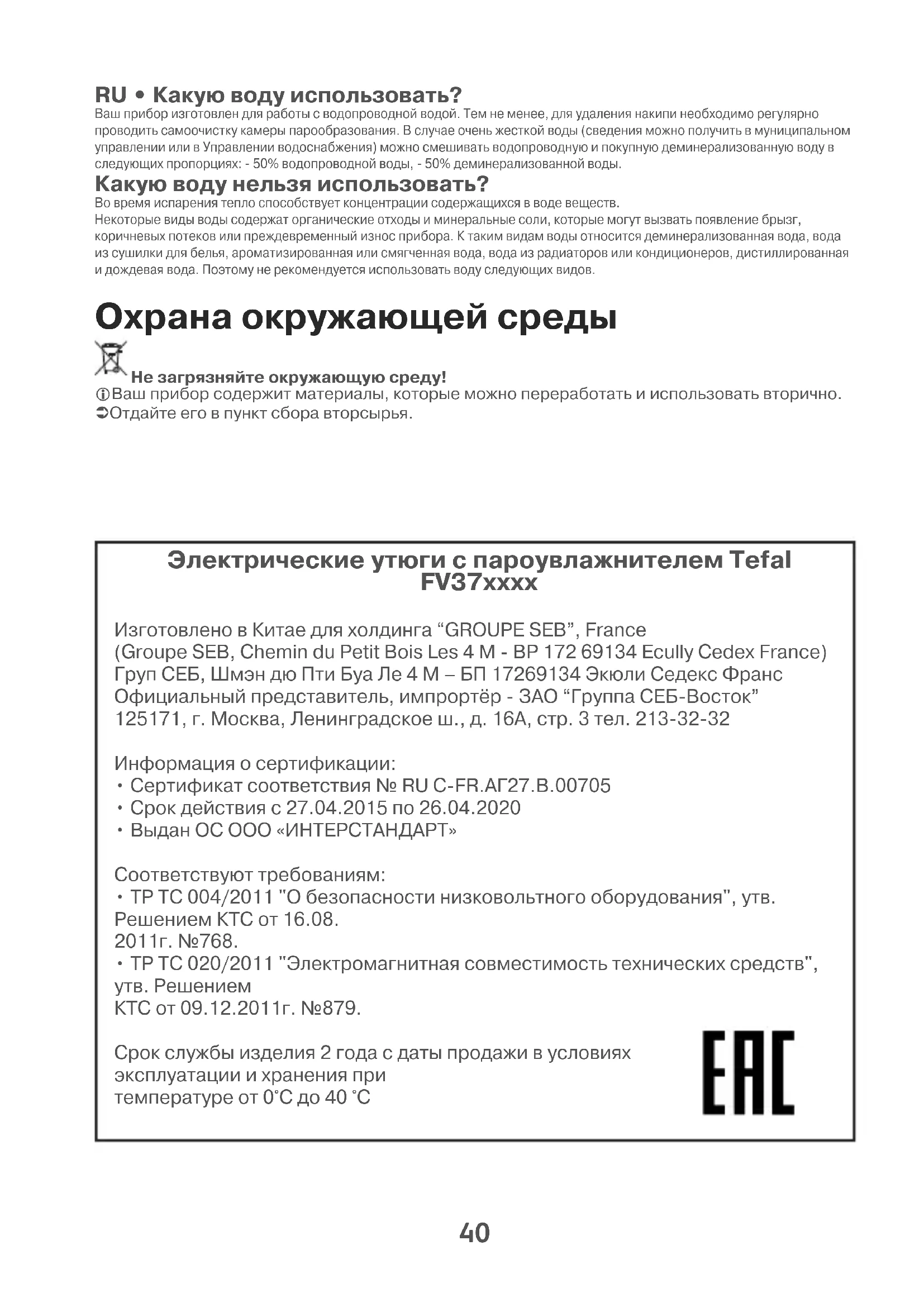 - ТР ТС 020/2011 "Электромагнитная совместимость технических средств", утв. Решением КТС от 09.12.2011г. №879. Срок службы изделия 2 года с даты продажи в условиях эксплуатации и хранения при температуре от 0°С до 40 °С 1800136985 FV37XX E0 A11.qxp_110x154 02/06/15 09:39 Page4041 ВОЗМОЖНЫЕ ПРИЧИНЫ СПОСОБ УСТРАНЕНИЯ Вода подтекает черезотверстия в подошве.Выбранная температуранедостаточна для образованияпара.Утюг недостаточно нагрет дляотпаривания.Вы слишком часто нажимаете накнопку подачи парового удара.Слишком сильная подача пара. Утюг хранился в горизонтальномположении, резервуар не былопорожнен, а регулятор не былустановлен в положение .Установите термостат в зону пара (от •• до МАХ).Дождитесь, пока сигнальная лампочкапогаснет.Соблюдайте интервал в несколько секундперед каждым нажатием. Уменьшите подачу пара.См. раздел "Хранение утюга".Коричневые подтекииз подошвы пачкаютбелье.Использование химическихпродуктов для удаления накипи.Используется не тот тип воды.Волокна тканей набиваются вотверстия подошвы иобугливаются.Вы плохо прополоскали белье,либо погладили новое,непостиранное белье.Не добавляйте в резервуар никаких средствдля удаления накипи.Произведите автоочистку и прочитайте главу"Какую воду использовать?".Произведите автоочистку и очистите подошвувлажной тряпочкой. Время от времениочищайте отверстия подошвы.Убедитесь, что белье достаточнопрополоскано, чтобы удалить возможныеотложения мыла или химических средств нановой одежде.Грязная иликоричневая подошвапачкает белье.Глажение при слишком высокойтемпературе.Вы используете крахмал приглажке.Очистите подошву, как указано выше.Отрегулируйте термостат в соответствии стаблицей температур.Очистите подошву, как указано выше.Добавляйте крахмал с изнаночной стороны.Незначительноеколичество илиотсутствие пара.Резервуар пуст.Противоизвестковый стерженьзагрязнен.Отложение накипи в утюге.Утюг слишком долгоиспользовался без пара.Заполните его.Очистите противоизвестковый стержень.Очистите противоизвестковый стержень ивыполните самоочистку.Выполните самоочистку.Подошва поцарапанаили повреждена.Утюг стоял в горизонтальномположении на металлическойподставке.Всегда ставьте утюг на пяту-опору.При заполнениирезервуара образуется Регулятор подачи пара не былустановлен в положение .Емкость для воды переполнена.Убедитесь, что регулятор подачи паранаходится в положении .Не превышайте Мах отметку.Пульверизатор нераспыляет воду.Емкость для воды недостаточнозаполнена.Наполните емкость для воды. Возможные неполадки При любых других возможных неполадках обращайтесь в авторизованный сервисный центр для проверки утюга. 1800136985 FV37XX E0 A11.qxp_110x154 02/06/15 09:39 Page41Характер проблемиЙмовiрнi випадки РекомендацiїВода тече черездiрки у пiдошвiВибрана температура недозволяє створювати пару.Ви використовуєте пару, тодiяк праска недостатньо гаряча.Ви занадто часто використовуєте ручку парового удару.Струмiнь пари є занадто.сильним.Ви поставили праскуплиском, не випорожнивши їїi не встановивши ручку пари Переведiть ручку термостата в секторпари (мiж •• i МАХ).Зачекайте поки не вимкнетьсясигнальна лампочка.Зачекайте декiлька секунд передкожним використанням.Зменшiть струмiнь.Подивiться роздiл “Поставте вашупраску”.Коричневi слiдивитiкання води зпiдошви бруднятьбiлизну.Ви використовуєте хiмiчнiп