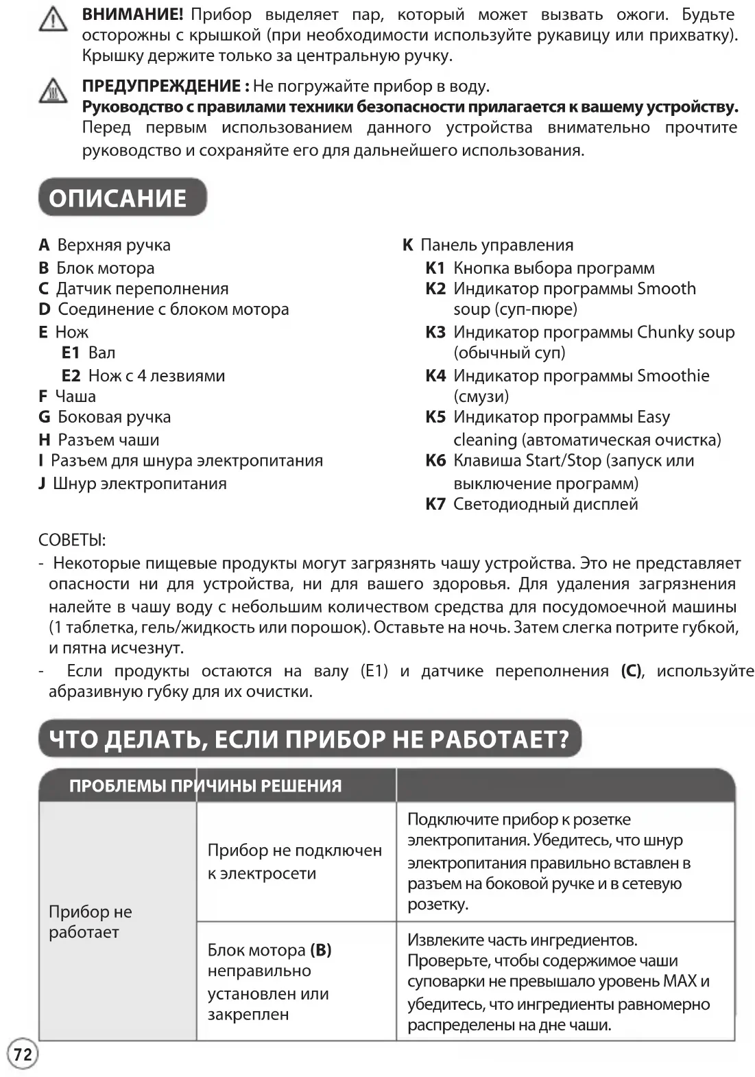 A Верхняя ручка B Блок мотора C Датчик переполнения D Соединение с блоком мотора E Нож E1 Вал E2 Нож с 4 лезвиями F Чаша G Боковая ручка H Разъем чаши I Разъем для шнура электропитания J Шнур электропитания K Панель управления K1 Кнопка выбора программ K2 Индикатор программы Smooth soup (суп-пюре) K3 Индикатор программы Chunky soup (обычный суп) K4 Индикатор программы Smoothie