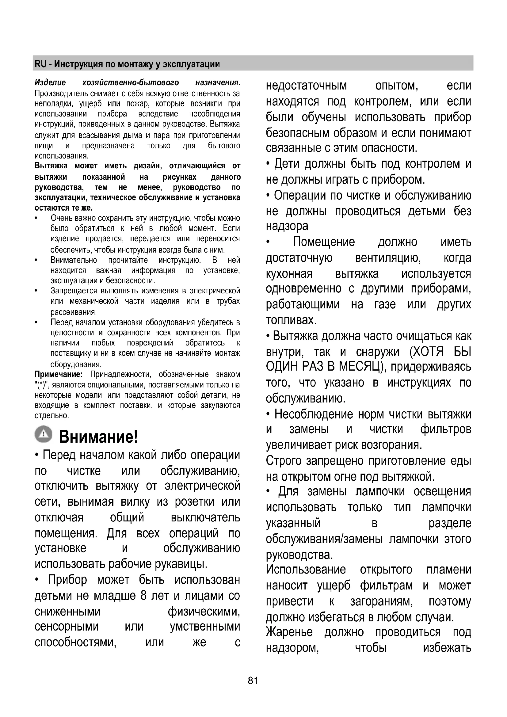- Вытяжка НИКОГДА не должна использоваться, как опорная поверхность, если только не указано иначе.