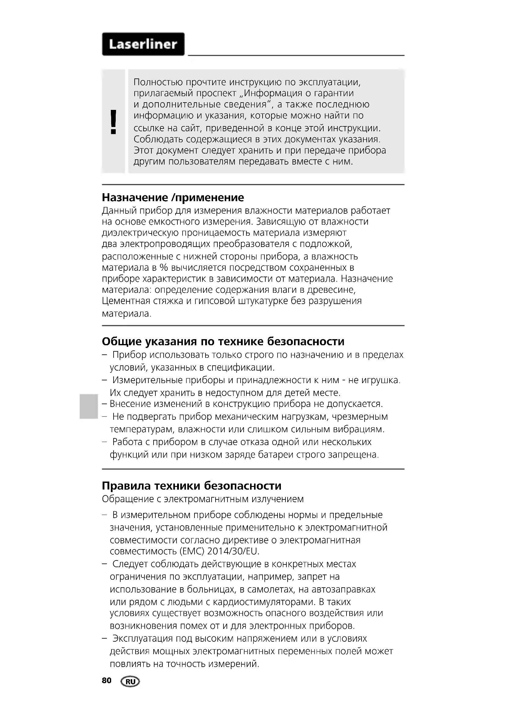 Общие указания по технике безопасности – Прибор использовать только строго по назначению и в пределах условий, указанных в спецификации. – Измерительные приборы и принадлежности к ним - не игрушка. Их следует хранить в недоступном для детей месте. – Внесение изменений в конструкцию прибора не допускается. – Не подвергать прибор механическим нагрузкам, чрезмерным температурам, влажности или слишком сильным вибрациям. – Работа с прибором в случае отказа одной или нескольких функций или при низком заряде батареи строго запрещена. Правила техники безопасности Обращение с электромагнитным излучением – В измерительном приборе соблюдены нормы и предельные значения, установленные применительно к электромагнитной совместимости согласно директиве о электромагнитная совместимость (EMC) 2014/30/EU. – Следует соблюдать действующие в конкретных местах ограничения по эксплуатации, например, запрет на использование в больницах, в самолетах, на автозаправках или рядом с людьми с кардиостимуляторами. В таких условиях существует возможность опасного воздействия или возникновения помех от и для электронных приборов. – Эксплуатация под высоким напряжением или в условиях действия мощных электромагнитных переменных полей может повлиять на точность измерений.MoistureFinder Compact