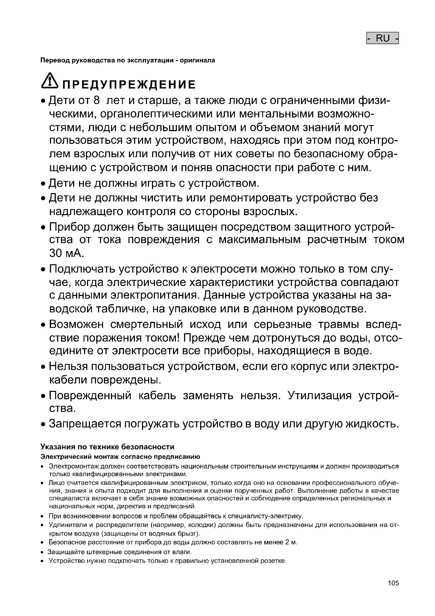 - Запрещается погружать устройство в воду или другую жидкость. Указания по технике безопасности Электрический монтаж согласно предписанию