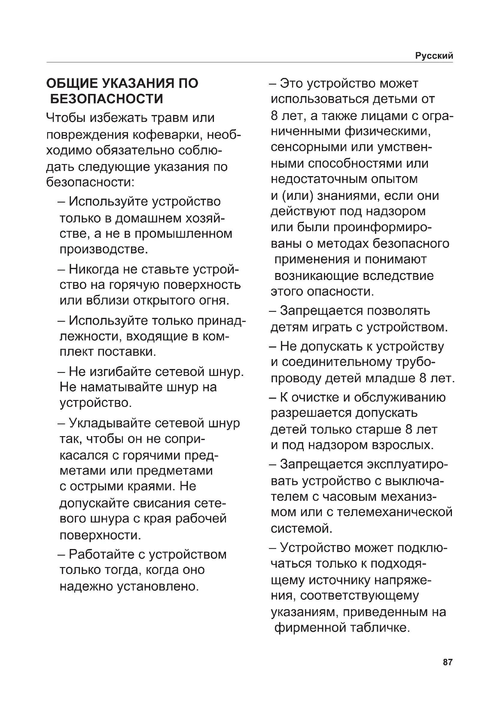 – Устройство может подклю- чаться только к подходя- щему источнику напряже- ния, соответствующему указаниям, приведенным на фирменной табличке. Русский88 – Устройство разрешается заполнять холодной водой только до максимально воз- можного количества чашек (отметка «max»). – Запрещается оставлять устройство во время его работы без присмотра. – Во время работы устройство не должно находиться в