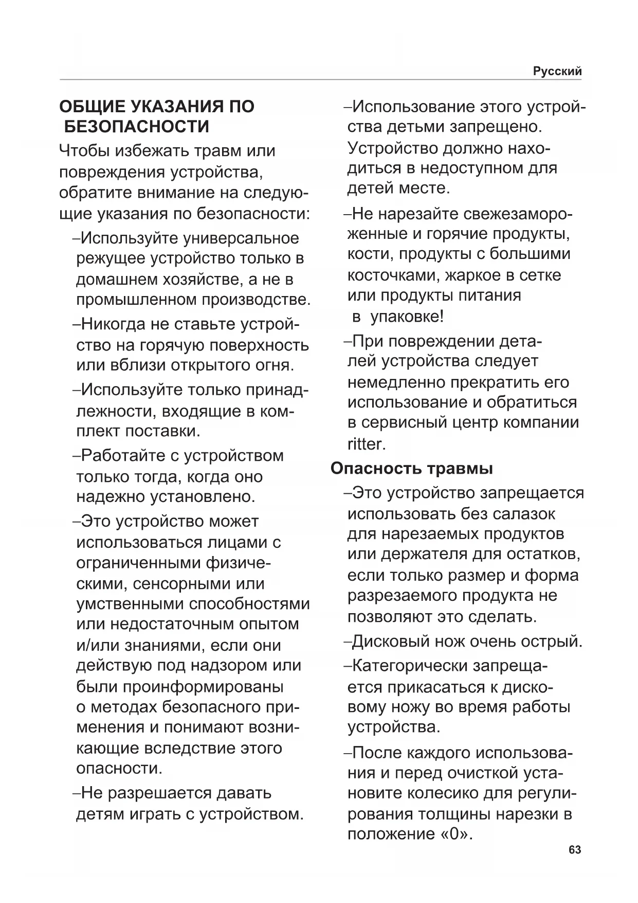 – Не разрешается давать детям играть с устройством. – Использование этого устрой- ства детьми запрещено. Устройство должно нахо- диться в недоступном для детей месте. – Не нарезайте свежезаморо- женные и горячие продукты, кости, продукты с большими косточками, жаркое в сетке или продукты питания в упаковке! – При повреждении дета- лей устройства следует немедленно прекратить его использование и обратиться в сервисный центр компании ritter. Опасность травмы – Это устройство запрещается использовать без салазок для нарезаемых продуктов или держателя для остатков, если только размер и форма разрезаемого продукта не позволяют это сделать. – Дисковый нож очень острый. – Категорически запреща- ется прикасаться к диско- вому ножу во время работы устройства. – После каждого использова- ния и перед очисткой уста- новите колесико для регули- рования толщины нарезки в положение «0».64 Откройте изображения на первой и последней странице