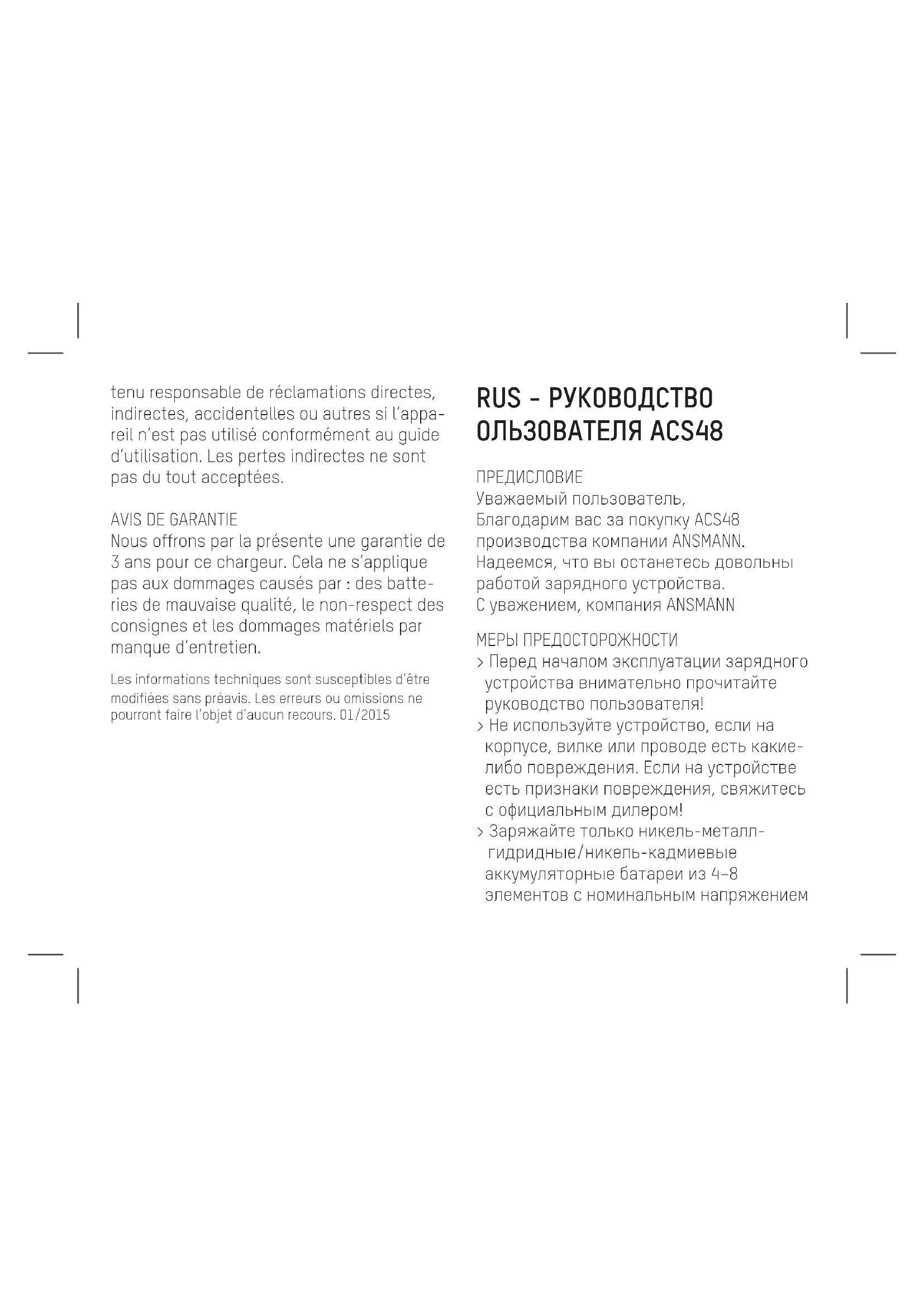 Nous offrons par la présente une garantie de 3 ans pour ce chargeur. Cela ne s’applique pas aux dommages causés par : des batte- ries de mauvaise qualité, le non-respect des consignes et les dommages matériels par manque d’entretien. Les informations techniques sont susceptibles d’être modifiées sans préavis. Les erreurs ou omissions ne pourront faire l’objet d’aucun recours. 01/2015 RUS - РУКОВОДСТВО ОЛЬЗОВАТЕЛЯ ACS48 ПРЕДИСЛОВИЕ Уважаемый пользователь, Благодарим вас за покупку ACS48 производства компании ANSMANN. Надеемся, что вы останетесь довольны работой зарядного устройства. С уважением, компания ANSMANN МЕРЫ ПРЕДОСТОРОЖНОСТИ > Перед началом эксплуатации зарядного устройства внимательно прочитайте руководство пользователя! > Не используйте устройство, если на корпусе, вилке или проводе есть какие- либо повреждения. Если на устройстве есть признаки повреждения, свяжитесь с официальным дилером! > Заряжайте только никель-металл- гидридные/никель-кадмиевые аккумуляторные батареи из 4–8 элементов с номинальным напряжением4,8 В – 9,6 В. Батареи других типов могут взорваться при зарядке с помощью данного устройства! > Соблюдайте полярность подключения аккумуляторных батарей (+/–)! > Используйте зарядное устройство только в сухих помещениях! > Для защиты от поражения электрическим током и предотвращения возгорания зарядное устройство необходимо беречь от воздействия высокой влажности и воды! > Очищайте устройство сухой тканью; перед очисткой отключайте его от электросети! > Не пытайтесь разобрать устройство! > Берегите устройство от детей! Не позволяйте детям играть с зарядным устройством! > Устройство не предназначено для использования детьми или людьми с ограниченными физическими, сенсорными или умственными способностями. Кроме того, неопытные пользователи, которые не прочитали настоящее руководство, могут использовать данное устройство только под присмотром или после инструктажа по работе с ним! > При несоблюдении мер предосторожности возникает риск повреждения устройства или аккумуляторов, а также получения травм пользователем! ОБЗОР ФУНКЦИЙ > Зарядное устройство для никель- металл-гидридных/никель-кадмиевых аккумуляторных батарей из 4–8 элементов (4,8 В – 9,6 В) > В комплект входит соединительный кабель с разъемом Tamiya для гоночных