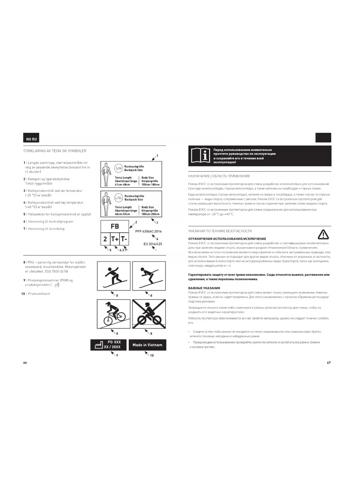 PPP 63046C:2014 НАЗНАЧЕНИЕ | ОБЛАСТЬ ПРИМЕНЕНИЯ УКАЗАНИЯ ПО ТЕХНИКЕ БЕЗОПАСНОСТИ Рюкзак EVOC со встроенным протектором для спины разработан исключительно для использования при езде на велосипедах, горных велосипедах, атакже катании на сноубордах игорных лыжах. Езда на велосипедах, горных велосипедах, катание на лыжах исноубордах, атакже спуски по горным склонам— виды спорта, сопряженные сриском. Рюкзак EVOC со встроенным протектором для спины уменьшает вероятность тяжелых травм вслучае падений при занятиях этими видами спорта. Рюкзак EVOC со встроенным протектором для спины предназначен для использования при температуре от –20°C до +40°C. Перед использованием внимательно прочтите руководство по эксплуатации исохраняйте его втечение всей эксплуатации! ОГРАНИЧЕНИЯ ИСПОЛЬЗОВАНИЯ/ИСКЛЮЧЕНИЕ Рюкзак EVOC со встроенным протектором для спины разработан исертифицирован исключительно дляz при занятиях видами спорта, указанными вразделе «Назначение/область применения». Исключениями из этого положения являются мероприятия исобытия вэкстремальных подвидах этих видов спорта. Этот рюкзак не подходит для других видов спорта, отличных от указанных, вчастности, для использования вмотоспорте или на моторизированных видах транспорта, таких как мотоциклы, снегоходы, квадроциклы и т.п. Гарантировать защиту от всех травм невозможно. Сюда относятся вывихи, растяжения или сдавления, атакже переломы позвоночника. ВАЖНЫЕ УКАЗАНИЯ Рюкзак EVOC со встроенным протектором для спины может только уменьшить возможные тяжелые травмы от удара, если он надет правильно. Для этого ознакомьтесь спунктом «Правильная посадка/ подгонка рюкзака». Запрещается вносить какие-либо изменения врюкзак, включая протектор для спины, чтобы не ухудшить его защитные характеристики. Гибкость протектора обеспечивается за счет свойств материала, однако не следует точечно сгибать