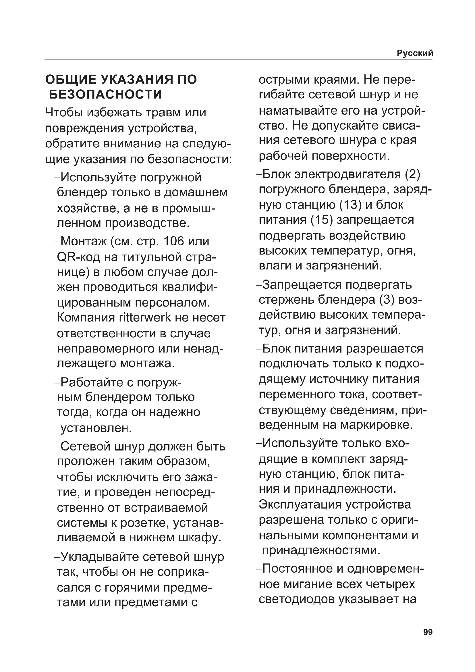În poziția corectă, mixerul vertical este xat la îndemână și LED-urile așajului LED (6) luminează intermitent. Română99 ОБЩИЕ УКАЗАНИЯ ПО БЕЗОПАСНОСТИ Чтобы избежать травм или повреждения устройства, обратите внимание на следую- щие указания по безопасности: – Используйте погружной блендер только в домашнем хозяйстве, а не в промыш- ленном производстве. – Монтаж (см. стр. 106 или QR-код на титульной стра- нице) в любом случае дол- жен проводиться квалифи- цированным персоналом. Компания ritterwerk не несет ответственности в случае неправомерного или ненад- лежащего монтажа. – Работайте с погруж- ным блендером только тогда, когда он надежно установлен. – Сетевой шнур должен быть проложен таким образом, чтобы исключить его зажа- тие, и проведен непосред- ственно от встраиваемой системы к розетке, устанав- ливаемой в нижнем шкафу. – Укладывайте сетевой шнур так, чтобы он не соприка- сался с горячими предме- тами или предметами с острыми краями. Не пере- гибайте сетевой шнур и не наматывайте его на устрой- ство. Не допускайте свиса- ния сетевого шнура с края рабочей поверхности. – Блок электродвигателя (2) погружного блендера, заряд- ную станцию (13) и блок питания (15) запрещается подвергать воздействию высоких температур, огня, влаги и загрязнений. – Запрещается подвергать стержень блендера (3) воз- действию высоких темпера- тур, огня и загрязнений. – Блок питания разрешается подключать только к подхо- дящему источнику питания переменного тока, соответ- ствующему сведениям, при- веденным на маркировке. – Используйте только вхо- дящие в комплект заряд- ную станцию, блок пита- ния и принадлежности. Эксплуатация устройства разрешена только с ориги- нальными компонентами и принадлежностями. – Постоянное и одновремен- ное мигание всех четырех светодиодов указывает на Русский100 серьезную поломку элек- тронных компонентов. Это может привести к опасной ситуации при замене наса- док или принадлежностей и запасных частей, а также во время очистки. Следует незамедлительно прекратить использование устройства и обратиться для проверки в авторизованный сервисный центр. Категорически запре- щается браться за насадку. Зарядка аккумуляторов в этом случае невозможна. – Использование этого устрой- ства детьми запрещено. Устройство и его сетевой шнур не должны быть доступны детям. – Это устройство может использоваться лицами с ограниченными физиче- скими, сенсорными или умственными способностями или недостаточным опытом и/или знаниями, если они действую под надзором или были проинформированы о методах безопасного при- менения и понимают возни- кающие вследствие этого